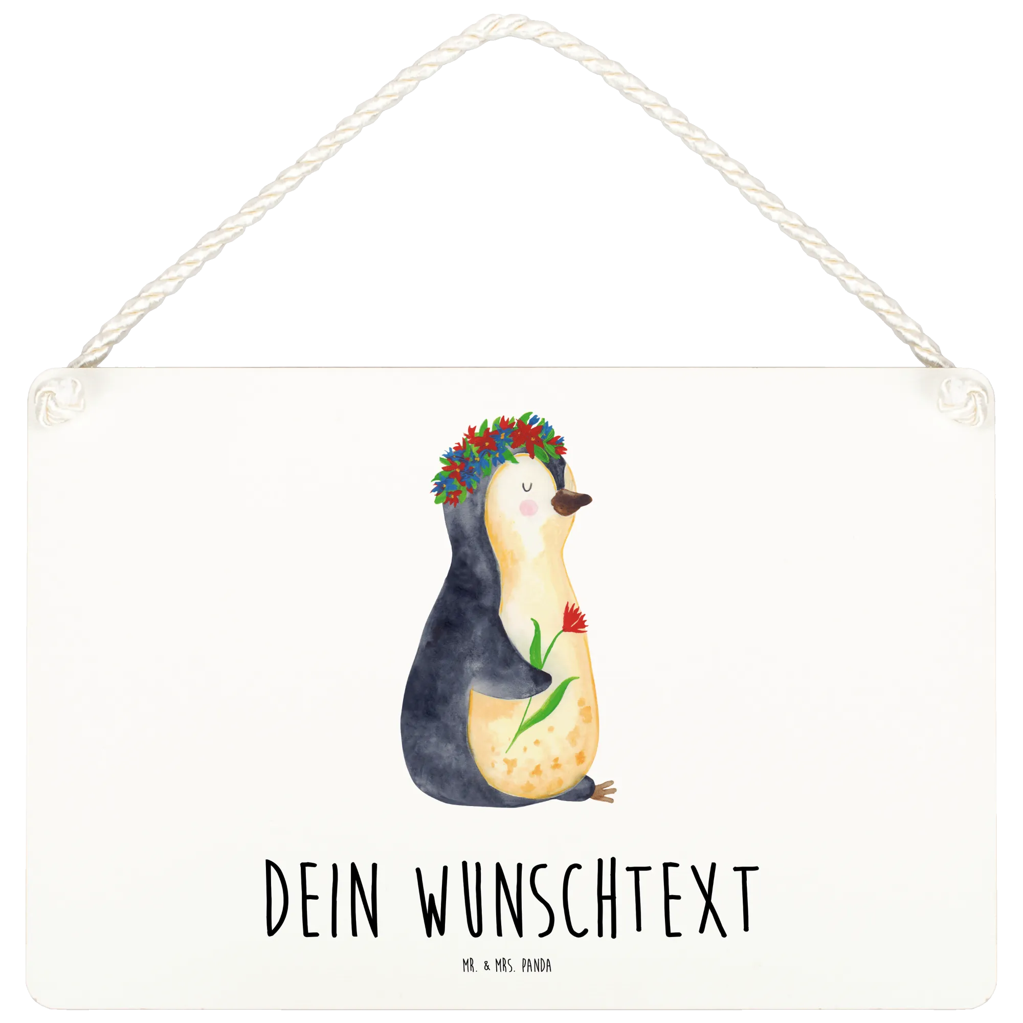 Der süße Pinguin mit seinem Blumenkranz hat eine unnachahmliche Ausstrahlung. Das Schild misst im Format DIN A3 und ist aus hochwertiger und beschichteter Holzfaser gefertigt, damit du lange Freude daran hast. Die edlen Farben und der langlebige Druck machen es zu einem besonderen Highlight bei jeder Deko. Die Oberfläche ist beschichtet, sodass sie robust und beständig ist.