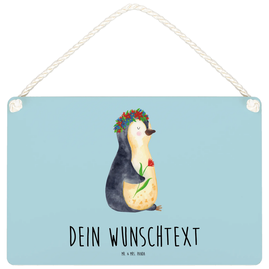 Personalisiertes Deko Schild Pinguin Blumenkranz - DIN A6 - Eisblau