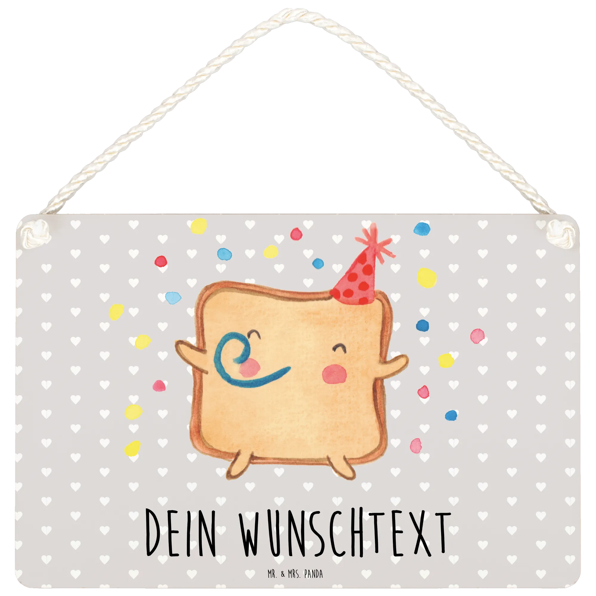 Dieses Schild aus hochwertigem MDF-Material ist nicht nur robust, sondern auch mit einer tollen Kordel zur Aufhängung versehen, die ihm das gewisse Etwas verleiht. Die fröhliche Zeichnung zeigt einen lächelnden Toast mit menschlichen Zügen und einem Partyhut, umgeben von bunten Konfetti-Punkten – perfekt für eine feierliche Atmosphäre.