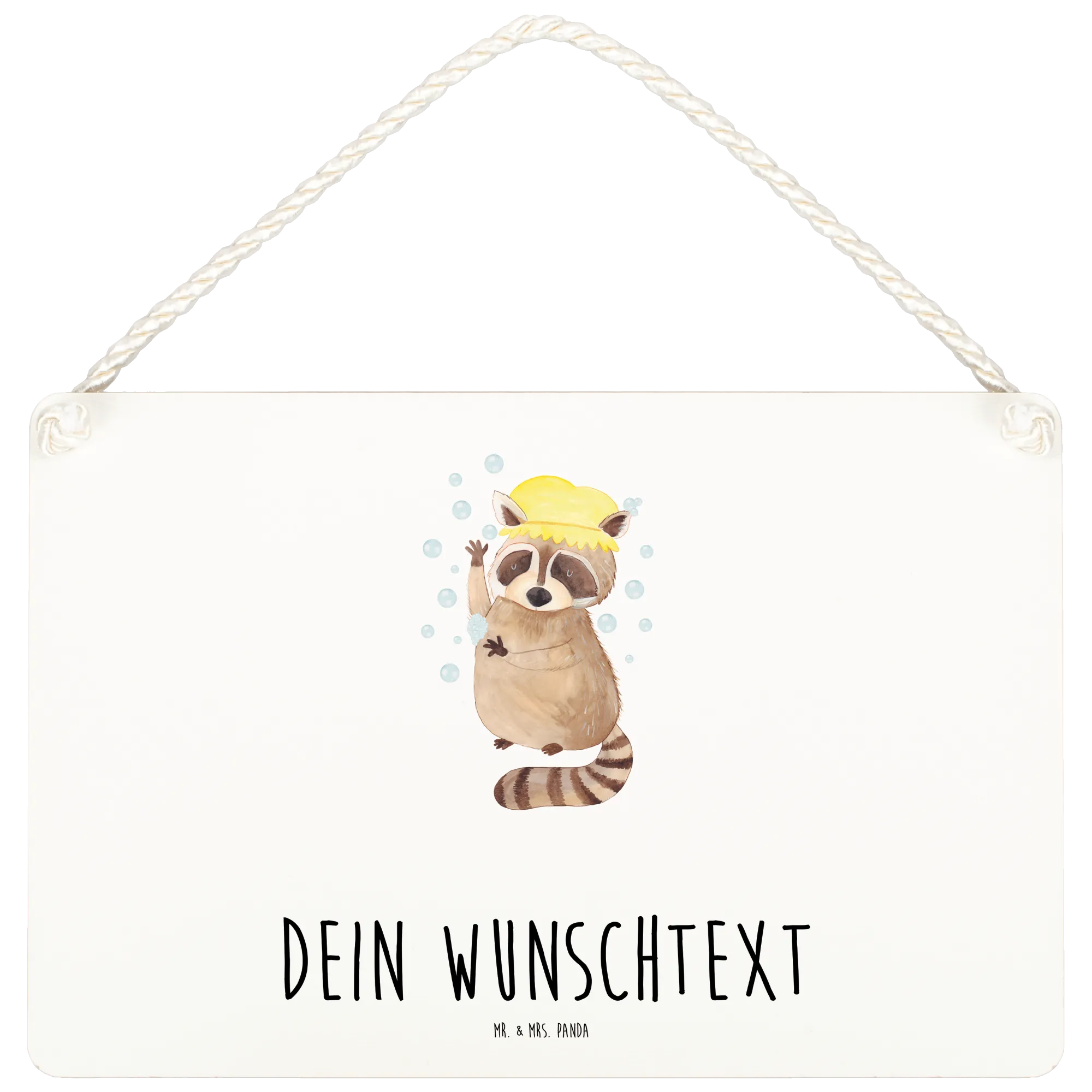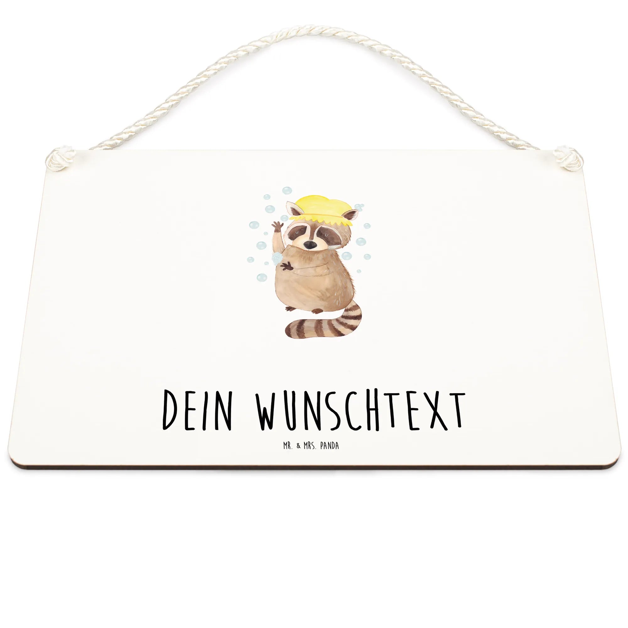 Häng es an die Wand oder befestige es an deiner Tür – es ist vielseitig einsetzbar! Das Design zeigt einen süßen Waschbären, der fröhlich unter einem Wasserstrahl badet, und der mit liebevollen Details von Mrs. Panda handgezeichnet wurde. Ideal für Badezimmer, Flure oder Kinderzimmer, bringt dieses Deko Schild gute Laune in jeden Raum.