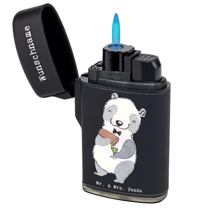 Jedes Feuerzeug kann mit deinem Wunschtext oder Namen personalisiert werden, wodurch es zu einem ganz persönlichen Geschenk wird. Das lustige Motiv zeigt einen süßen Panda mit einem Cocktailmixer, der Cocktails zubereitet, und wird von dem Spruch 'Du bist nur ein halber Mensch, wenn du kein Barkeeper bist.' begleitet.