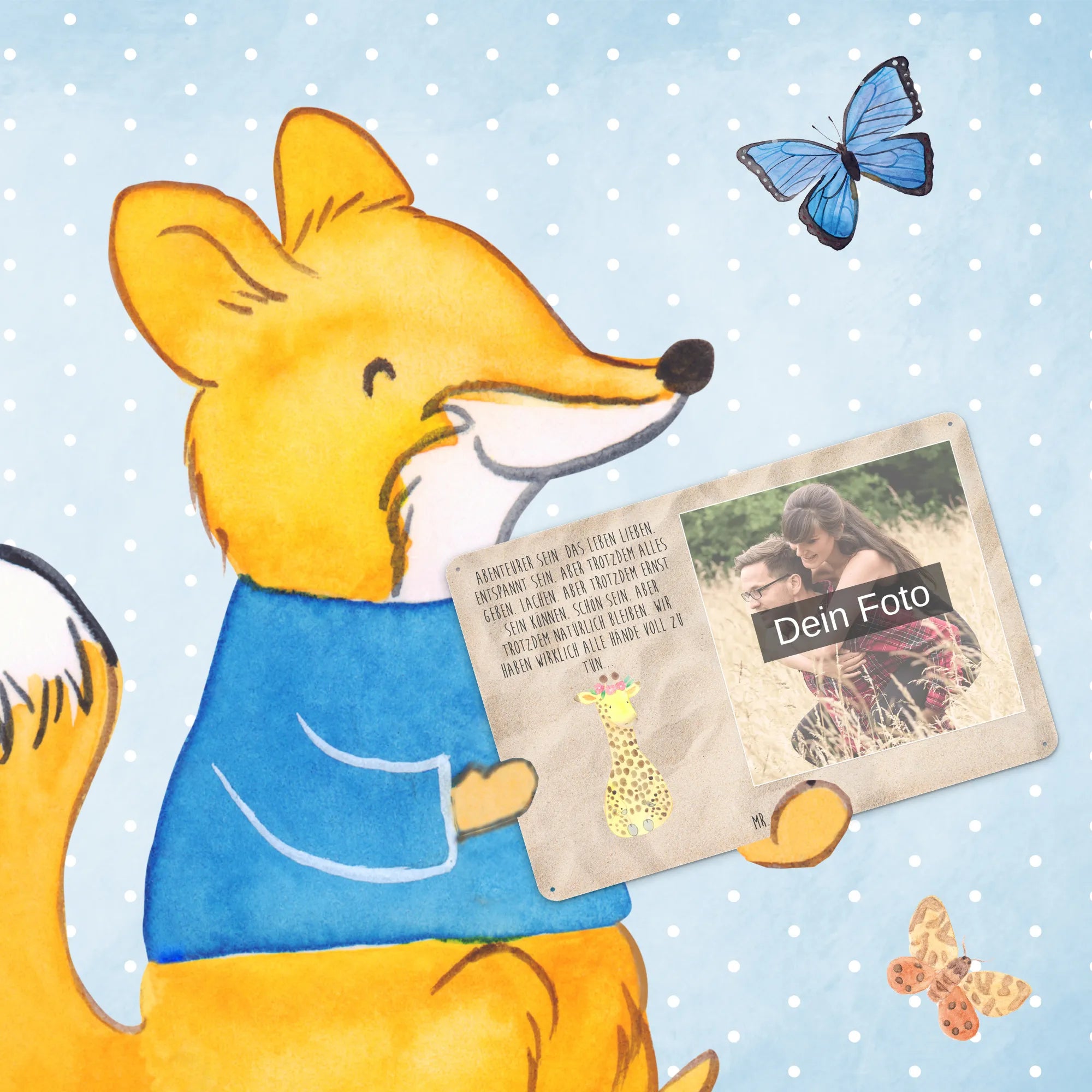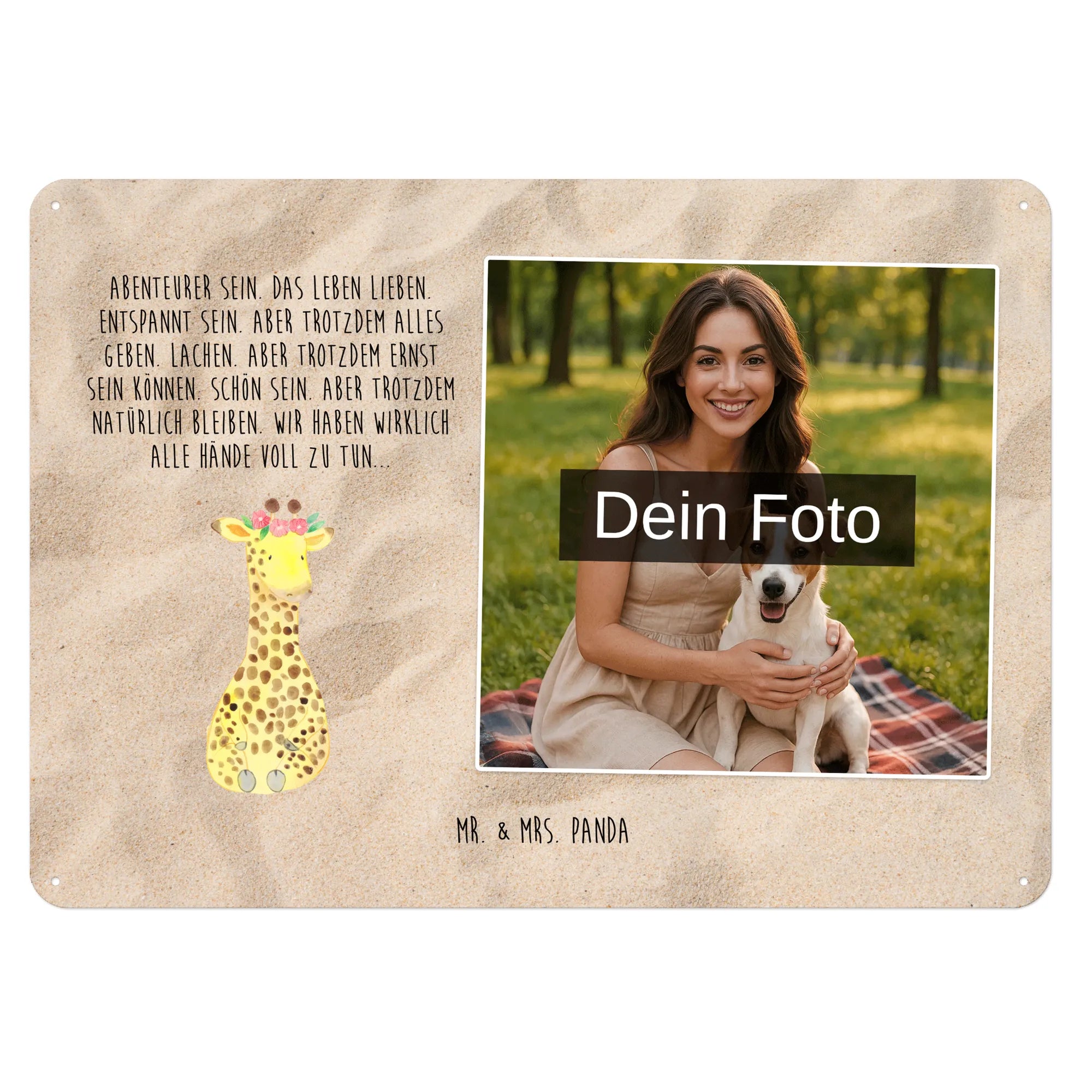 Blechschild mit eigenem Foto personalisiert – liebevoll gestaltet von Mr. & Mrs. Panda. Dieses edle Schild wird mit deinem Foto und unseren niedlichen Illustrationen bedruckt, sodass ein individuelles Dekostück entsteht. Achte unbedingt auf gute Bildqualität und geeigneten Bildausschnitt, damit das Motiv klar und harmonisch wirkt. Bitte nur eigene Bilder oder solche mit Nutzungsrecht hochladen. Gefertigt aus hochwertigem Stahlblech ohne Wölbung mit seidenmatter Oberfläche, bietet das Schild eine edle Optik. Maße: 70 mm x 297 mm x 210 mm. Der Druck ist langlebig und hochwertig verarbeitet. Für sicheren Halt gibt es vier Bohrungen, umgefalzte Kanten und abgerundete Ecken. Ideal für Innenräume, ob an der Tür, im Eingangsbereich oder an der Wohnzimmerwand. Pflegeleicht: einfach mit einem feuchten Tuch abwischen. In mehreren Größen erhältlich, so findest du garantiert die passende Variante. Verschenke Erinnerungen oder gestalte dein Zuhause persönlich — mit dem Blechschild mit eigenem Foto personalisiert von Mr. & Mrs. Panda wird jeder Raum ein Stückchen liebevoller.