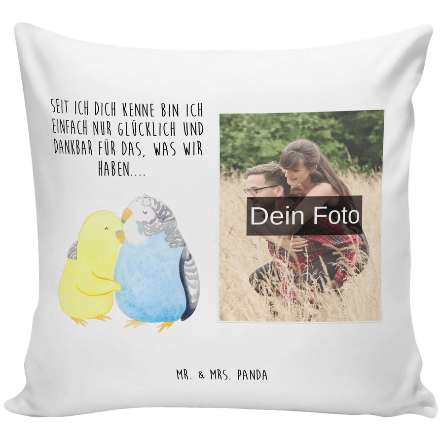 Das personalisierte Foto Kissen mit dem zauberhaften Motiv "Wellensittich Liebe" von Mr. & Mrs. Panda ist das ideale Geschenk für alle, die ihre Liebe auf besondere Weise ausdrücken möchten.