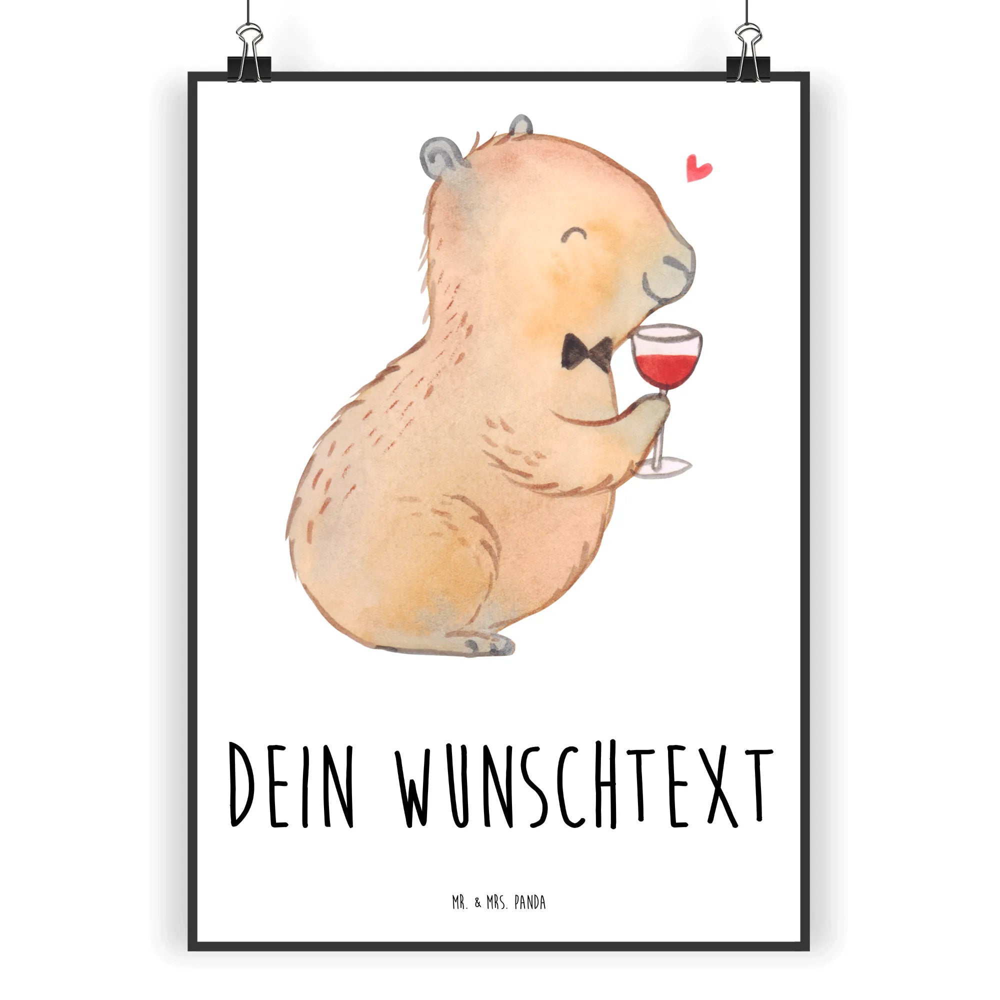 Das personalisierte Poster mit dem wunderschönen Capybara-Wein-Motiv aus der Small World Kollektion von Mr. & Mrs. Panda ist das ideale Geschenk für Weinliebhaber, Tierfreunde und Menschen mit einem Sinn für Humor! Dieses liebevoll gestaltete Kunstwerk zeigt ein charmantes Capybara, das mit einem glücklichen Lächeln ein Glas Wein hält und gleichzeitig elegant mit einer schwarzen Fliege gekleidet ist. Mit einem schwebenden roten Herzen über ihm strahlt dieses Poster pure Freude und Lebenslust aus.