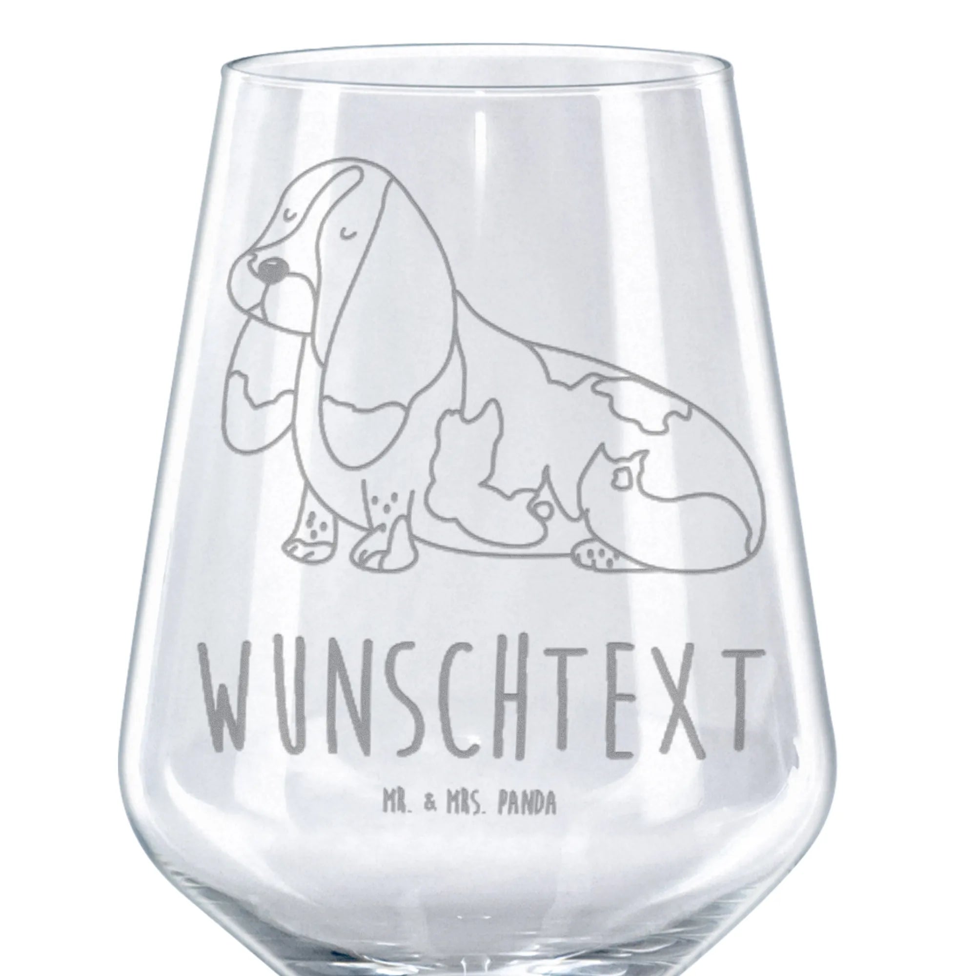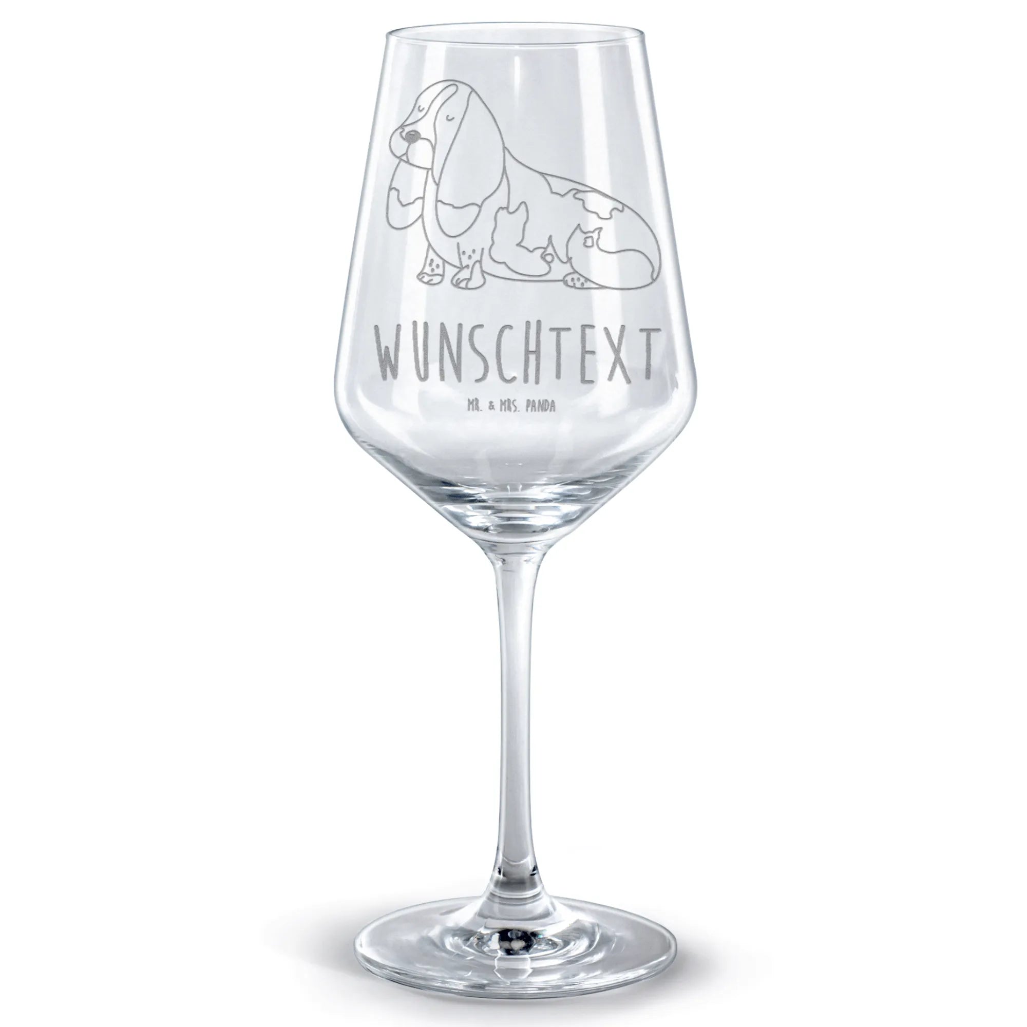 Ein personalisiertes Rotweinglas mit dem süßen Basset Hound-Motiv aus der Hunde Kollektion von Mr. & Mrs. Panda ist das perfekte Geschenk für alle Weinliebhaber und Hundebesitzer. Beim Anstoßen mit diesem hochwertigen Glas wird jeder Schluck Rotwein zu einem besonderen Moment.