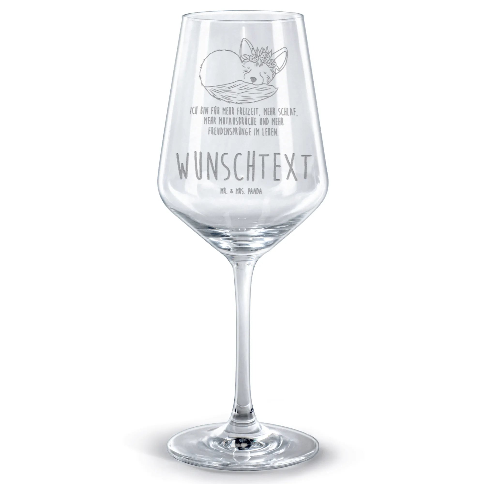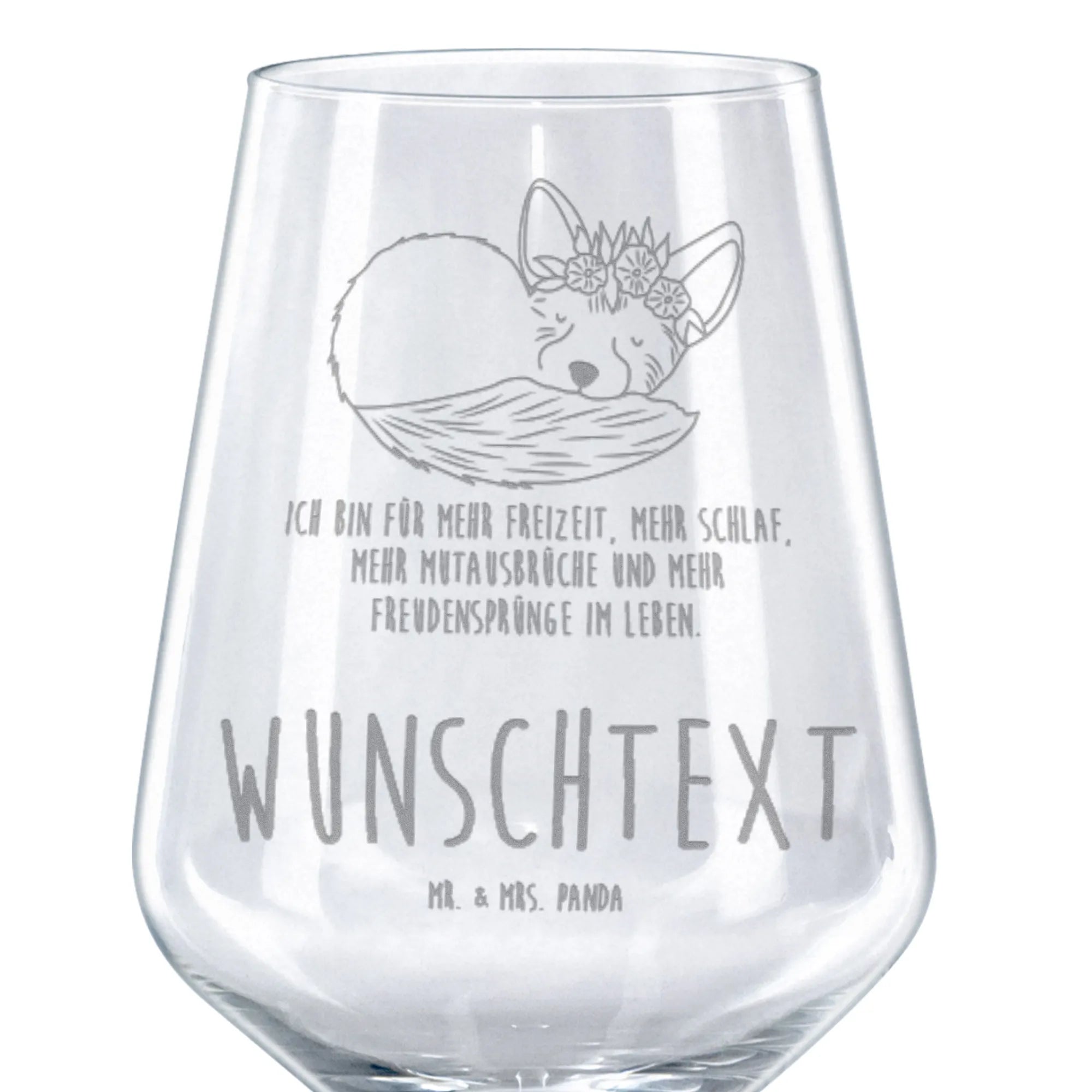 Perfektes Geschenk mit Herz 💛 – Unser personalisiertes Rotweinglas „Wüstenfuchs Blumenkranz“ aus der Afrika-Kollektion ist ein liebevoll gestaltetes Bordeauxglas mit Gravur und Wunschtext. Das handgezeichnete Motiv zeigt einen süßen, schlafenden Wüstenfuchs mit Blumenkranz und kombiniert bezaubernde Illustration mit dem fröhlichen Spruch: „Ich bin für mehr Freizeit, mehr Schlaf, mehr Mutausbrüche und mehr Freudensprünge im Leben.“