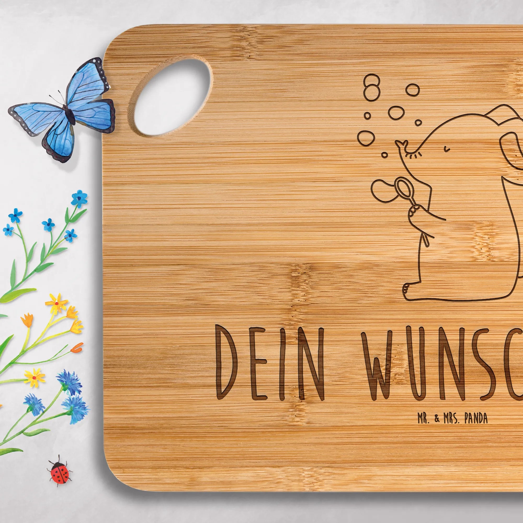Der süße Elefant, der bunte Seifenblasen in die Luft pustet, bringt nicht nur Freude in die Küche, sondern ist auch ein schöner Hingucker in jedem Haushalt. Dein Wunschtext oder Name wird in langlebiger Lasergravur auf das Holzbrett affichiert, wodurch jede Kreation zu einem Unikat wird.