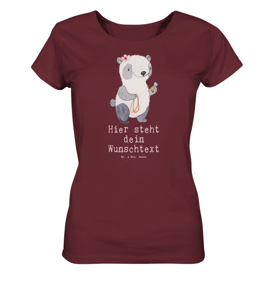 Das personalisierte Shirt Damen mit dem aufwendigen Motiv Goldschmiedin mit Herz ist das perfekte Geschenk für jede Goldschmiedin und Schmuckliebhaberin. Ob für den Junggesellenabschied, das Jubiläum, den Geburtstag oder einfach als nette Geste für eine Kollegin oder Mitarbeiterin – dieses Shirt ist ein echter Hingucker! Die liebevoll gestaltete Aquarell-Illustration zeigt eine süße Panda-Dame, die stolz ihren Goldschmuck präsentiert. Der Spruch „Du bist nur ein halber Mensch, wenn du keine Goldschmiedin bist“ sorgt zusätzlich für Lacher und hebt die besondere Leidenschaft für diesen Beruf hervor.