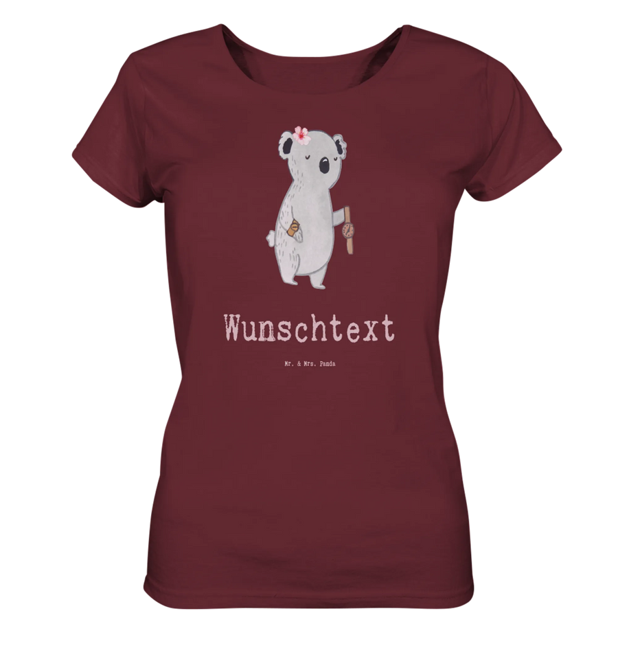 Das Personalisiertes Shirt Damen "Uhrmacherin mit Herz" aus der besonderen Kollektion Berufe ist das perfekte Geschenk für jede liebevolle Uhrmacherin! Mit einem süßen, handgezeichneten Motiv, das eine weibliche Koala zeigt, die stolz ihre goldene Uhr präsentiert, bringt dieses Shirt Freude und ein Schmunzeln in den Alltag.