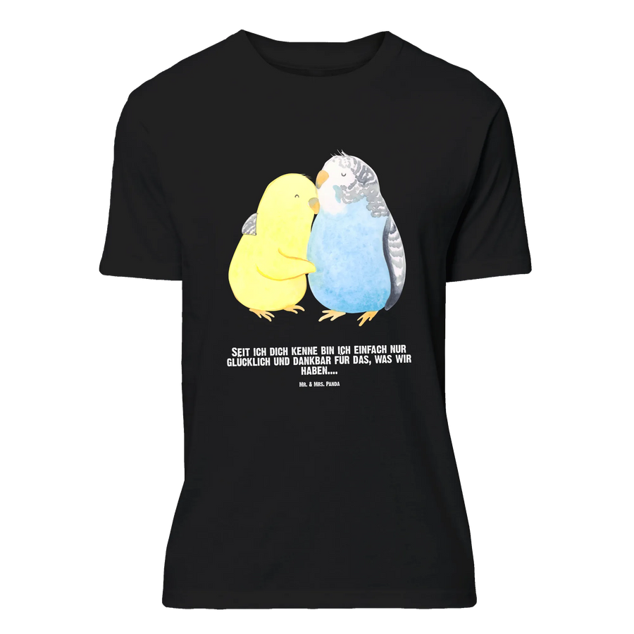 Das perfekte Geschenk für Verliebte – unser personalisiertes T-Shirt mit dem bezaubernden Motiv "Wellensittich Liebe" aus der Liebe Kollektion von Mr. & Mrs. Panda! Dieses T-Shirt ist mehr als nur ein Kleidungsstück; es ist ein Ausdruck deiner Zuneigung zu jemandem ganz Besonderen in deinem Leben. Mit einem harmonischen Design, das ein Paar liebevoller Wellensittiche zeigt, vermittelt es die Botschaft von Nähe, Kuscheln und unendlichem Vertrauen.