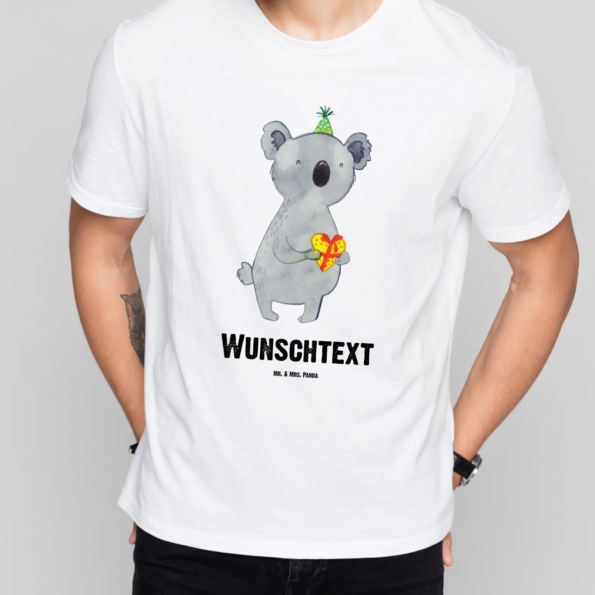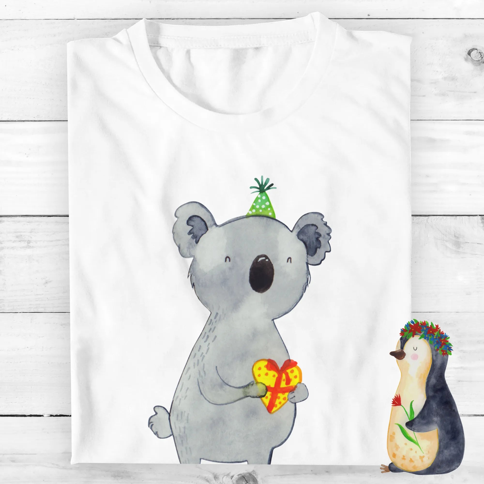 Suchst du das perfekte Geschenk für einen Koala-Fan? Unser personalisiertes T-Shirt mit dem niedlichen Koala-Motiv ist die ideale Wahl! Mit einem süßen Koala, der einen Partyhut trägt und ein Herzgeschenk in der Hand hält, verbreitet dieses Shirt Freude und bringt ein Lächeln auf jedes Gesicht.