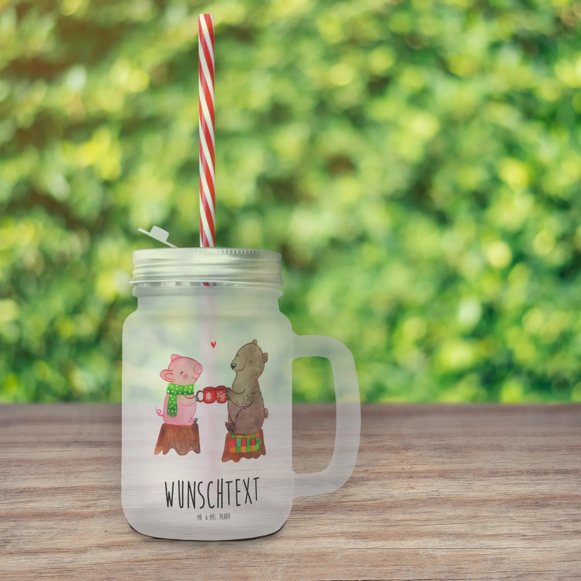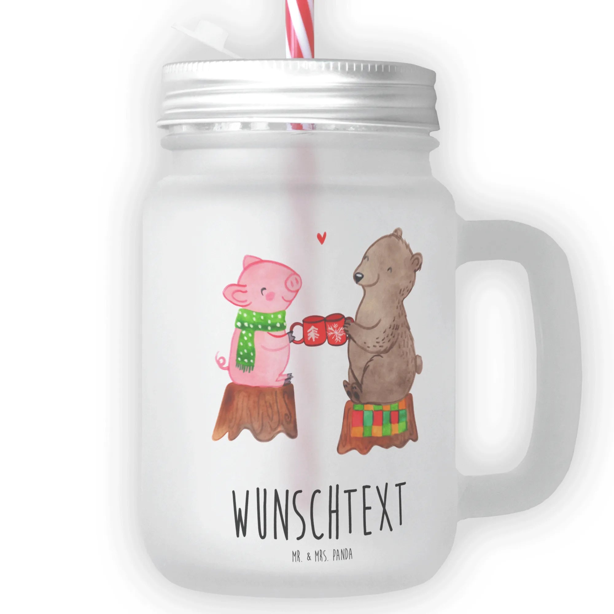 Das personalisierte Trinkglas Mason Jar mit dem liebevollen Motiv Glühschwein Sause aus der Winter Kollektion von Mr. & Mrs. Panda ist das perfekte Geschenk für die besinnliche Zeit des Jahres. Ob zu Weihnachten, Neujahr oder einfach, um die gemütlichen Winterabende zu zelebrieren – dieses Glas ist ein echter Blickfang und bringt Freude in jedes Zuhause. Ein hübsches Schweinchen mit einem Schal und ein niedlicher Bär stoßen hier fröhlich an und wünschen sich 'Alles Gute'. Diese zauberhafte Szene vermittelt das Gefühl von Wärme und Gemütlichkeit, das wir in der kalten Jahreszeit so lieben.