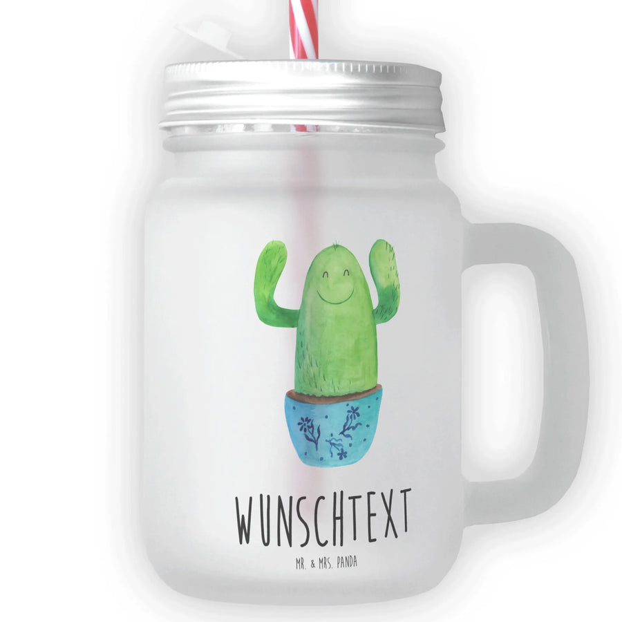 Das personalisierte Trinkglas Mason Jar Kaktus Happy von Mr. & Mrs. Panda ist der perfekte Begleiter für heiße Sommertage und erfrischende Cocktails. Mit seinem fröhlichen Kaktus-Motiv bringt dieses edle, matte Trinkglas nicht nur Farbe in dein Leben, sondern auch gute Laune! Es wurde liebevoll von Mrs. Panda handgezeichnet und stellt einen fröhlichen Kaktus in einem hübschen blauen Blumenkopf dar.