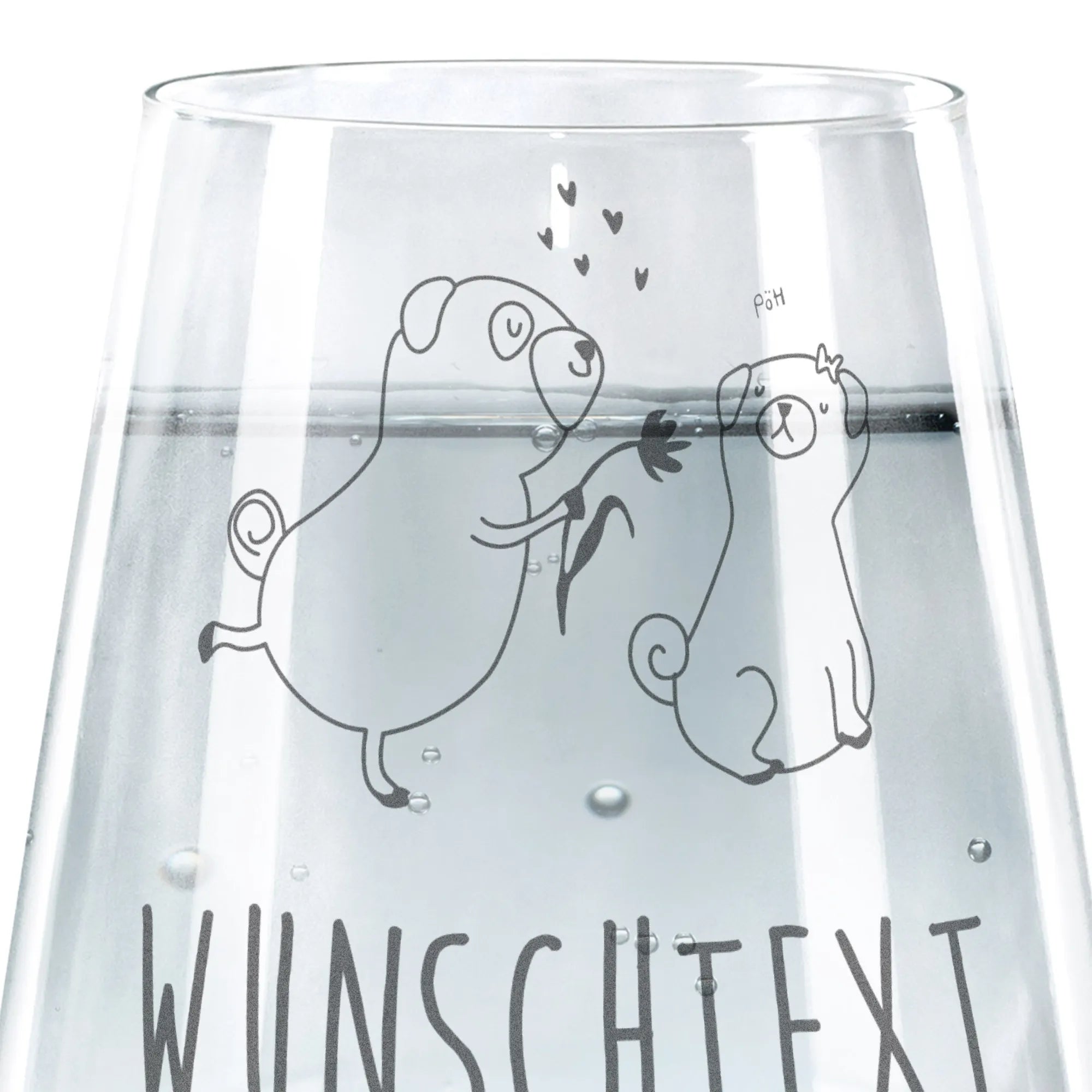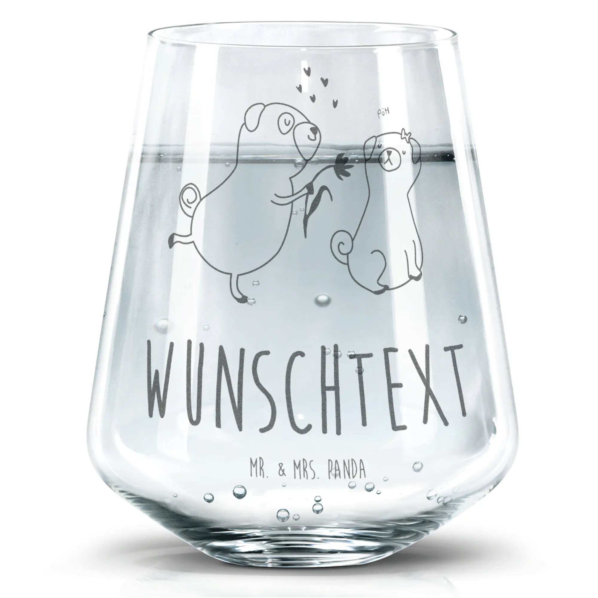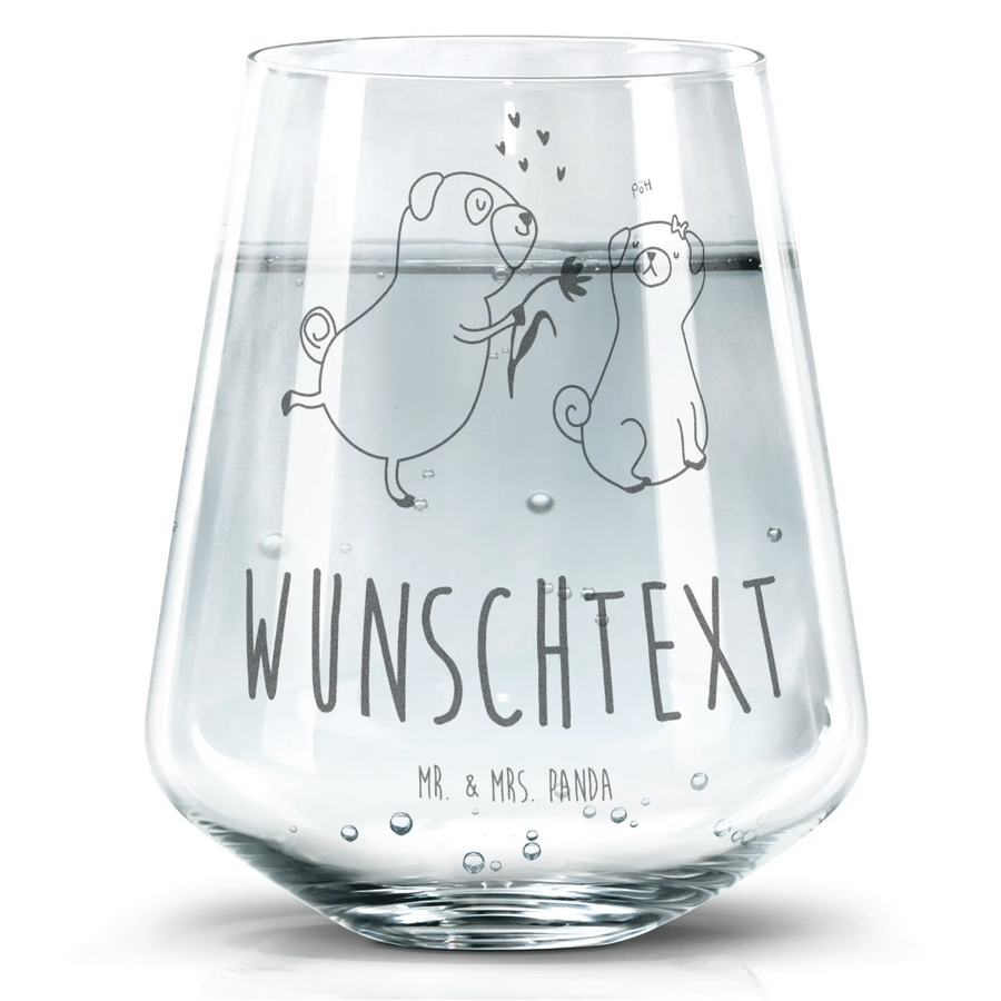 Das personalisierte Trinkglas mit dem niedlichen Mops-Motiv "verliebt" von Mr. & Mrs. Panda ist das perfekte Geschenk für alle Hundeliebhaber und Tierfreunde. Es besticht durch seine liebevolle Darstellung zweier Mops-Hunde, die voller Zuneigung zueinander stehen.