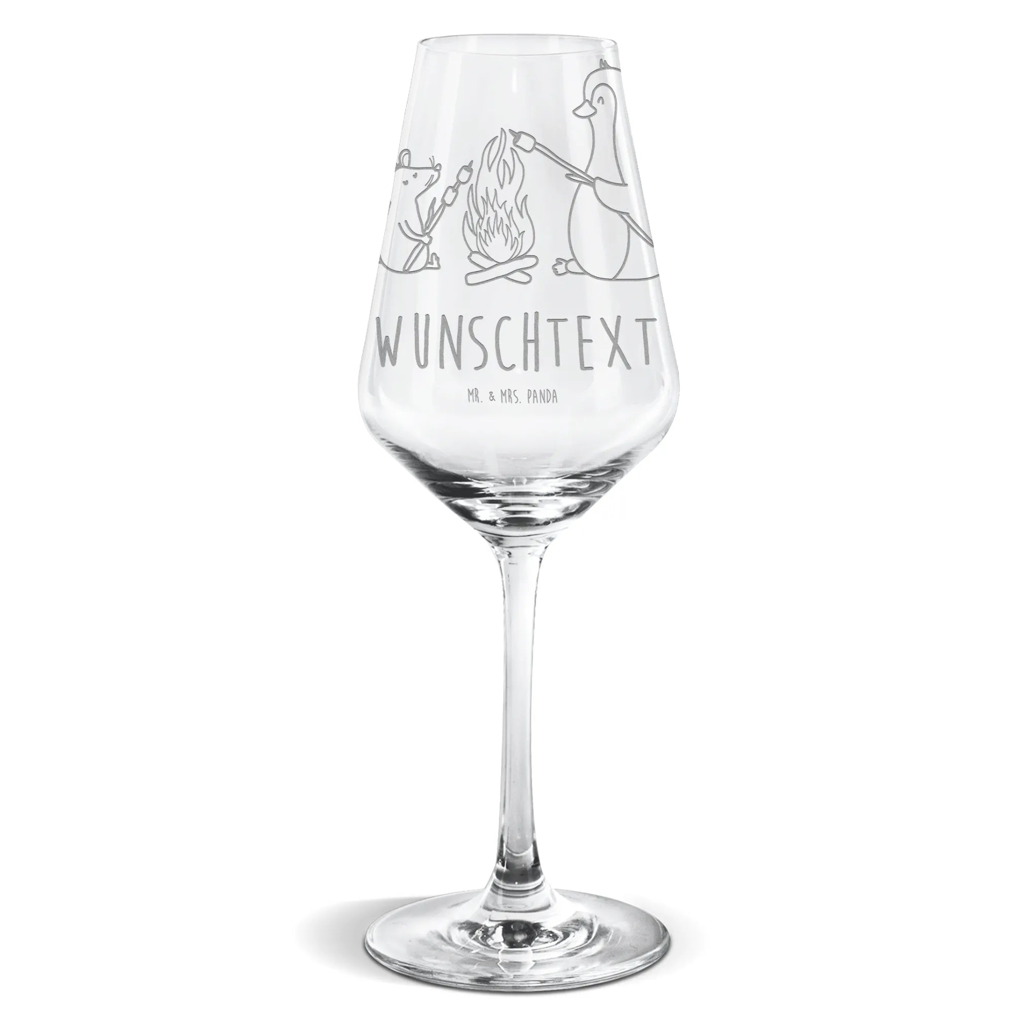 Personalisiertes Weißwein Glas Pinguin Lagerfeuer