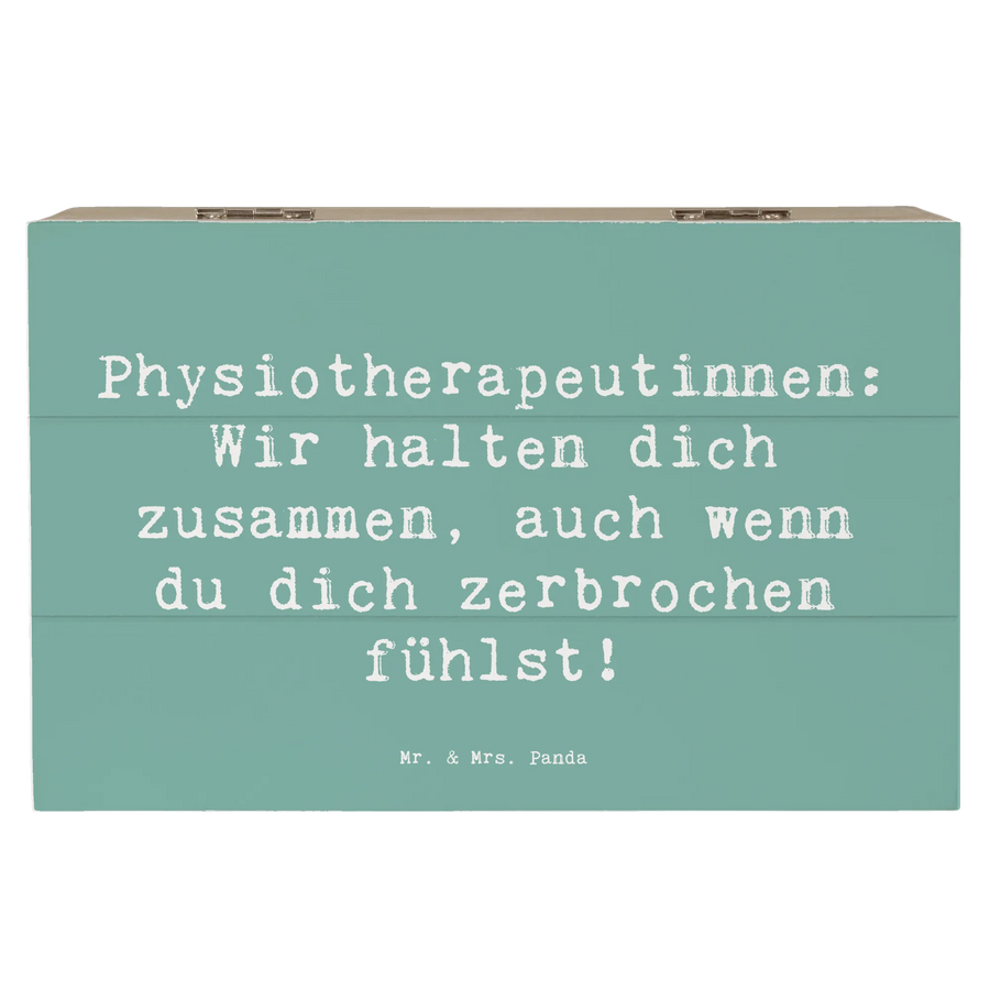 Die Holzkiste „Physiotherapeutin“ von Mr. & Mrs. Panda ist das perfekte Geschenk für alle, die in diesem anspruchsvollen Beruf tätig sind. Sie ist nicht nur ein wunderschöner Aufbewahrungsort für Erinnerungen, sondern auch ein liebevolles Statement. Mit dem originellen Spruch "Physiotherapeutinnen: Wir halten dich zusammen, auch wenn du dich zerbrochen fühlst!" vermittelt diese Kiste Wertschätzung und Anerkennung.