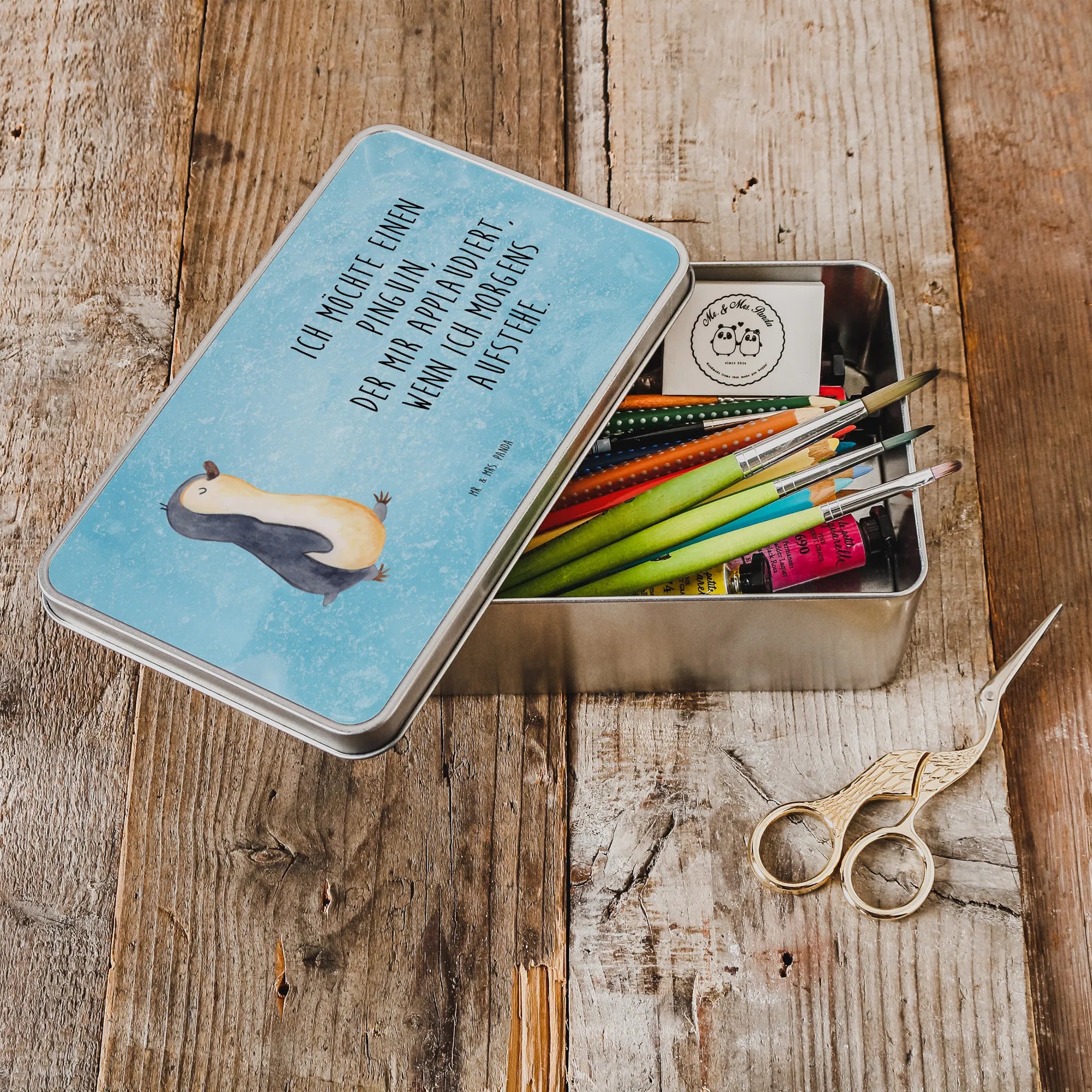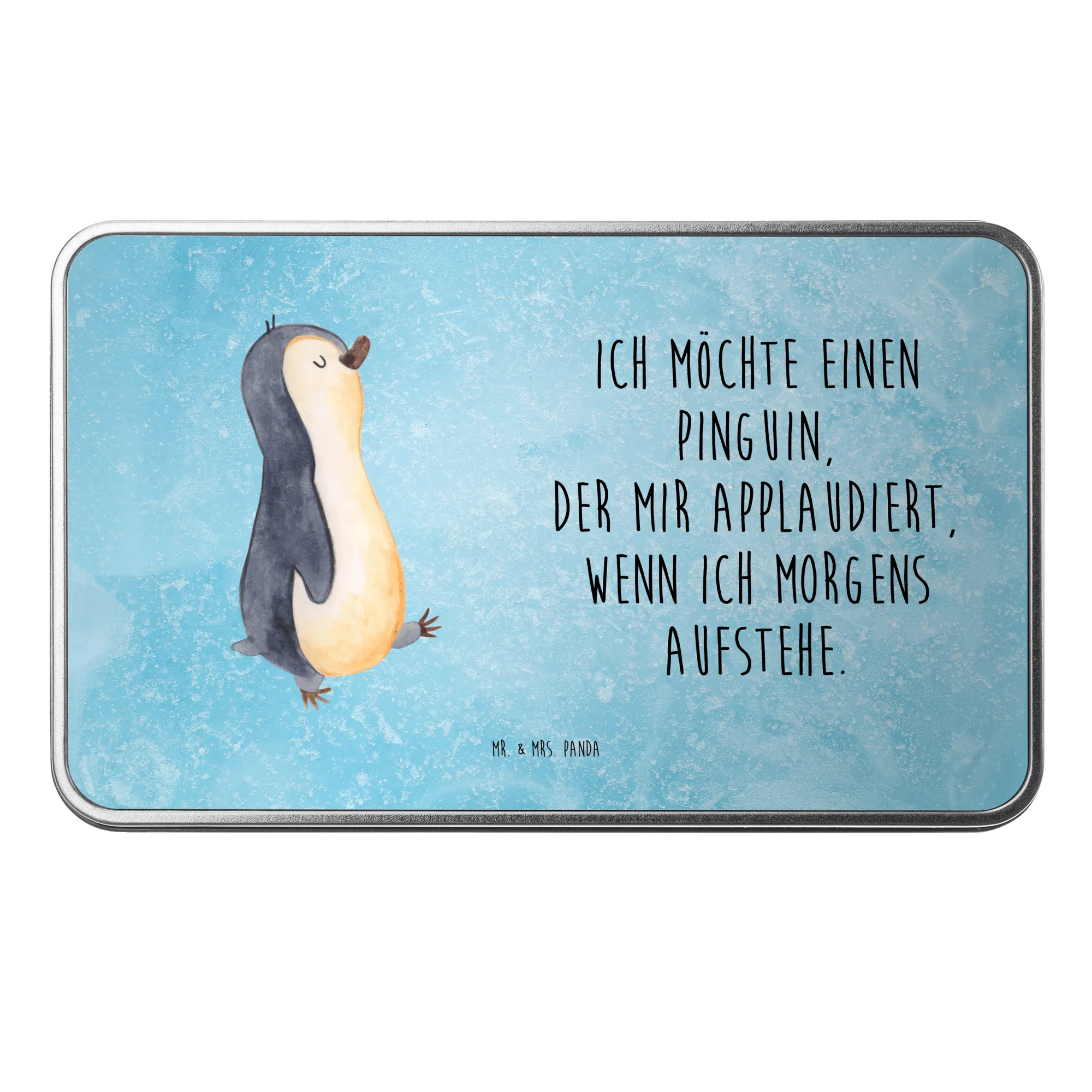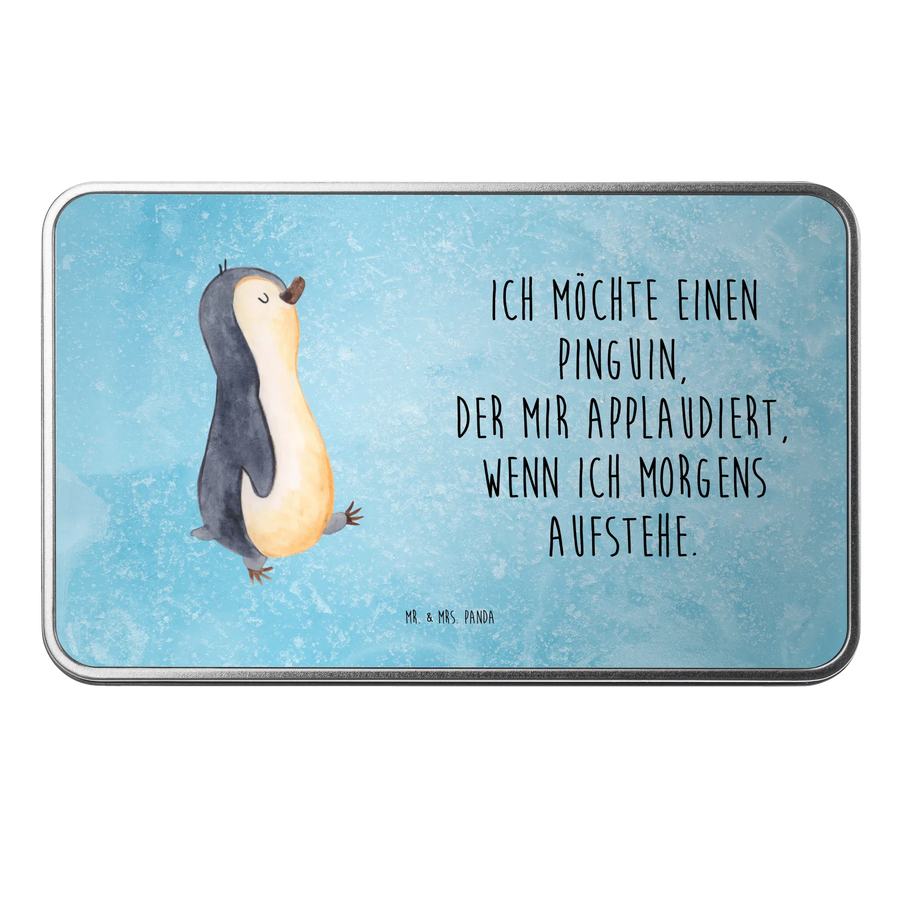 Begrüße den Tag mit einem Lächeln! Unsere Metalldose „Pinguin marschierend“ aus der Pinguin - Kollektion von Mr. & Mrs. Panda ist mehr als nur eine Dose – sie ist ein fröhlicher Begleiter für deinen Alltag. Das handgezeichnete Motiv zeigt einen charmanten, etwas tollpatschigen Pinguin auf eisblauem Hintergrund und trägt den lustigen Spruch: „Ich möchte einen Pinguin, der mir applaudiert, wenn ich morgens aufstehe.“ 😊