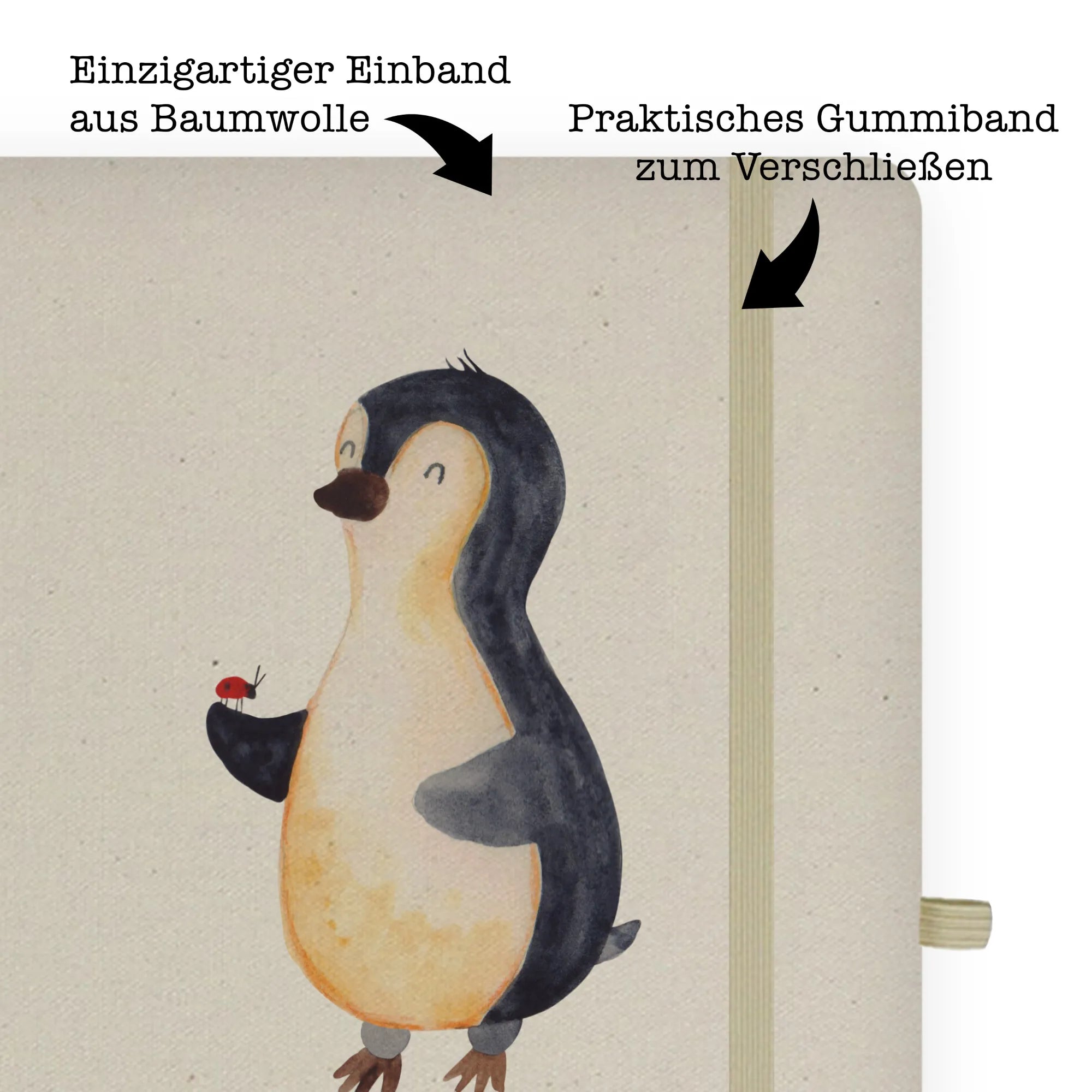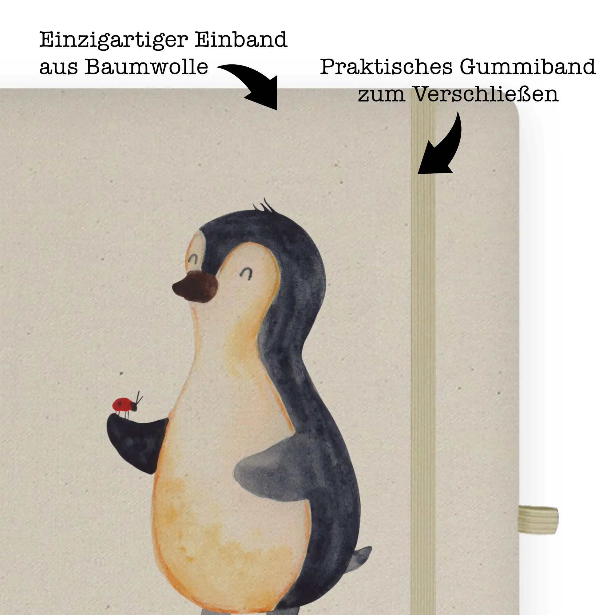 Entdecke das charmante DIN A5 Baumwoll Notizbuch mit dem fröhlichen Pinguin und dem süßen Marienkäfer aus der Pinguin-Kollektion von Mr. & Mrs. Panda! Dieses wunderschöne und edle Baumwollnotizbuch ist mehr als nur ein einfaches Schreibbuch; es ist der perfekte Begleiter für alle kreativen Köpfe und Nachwuchsautoren!