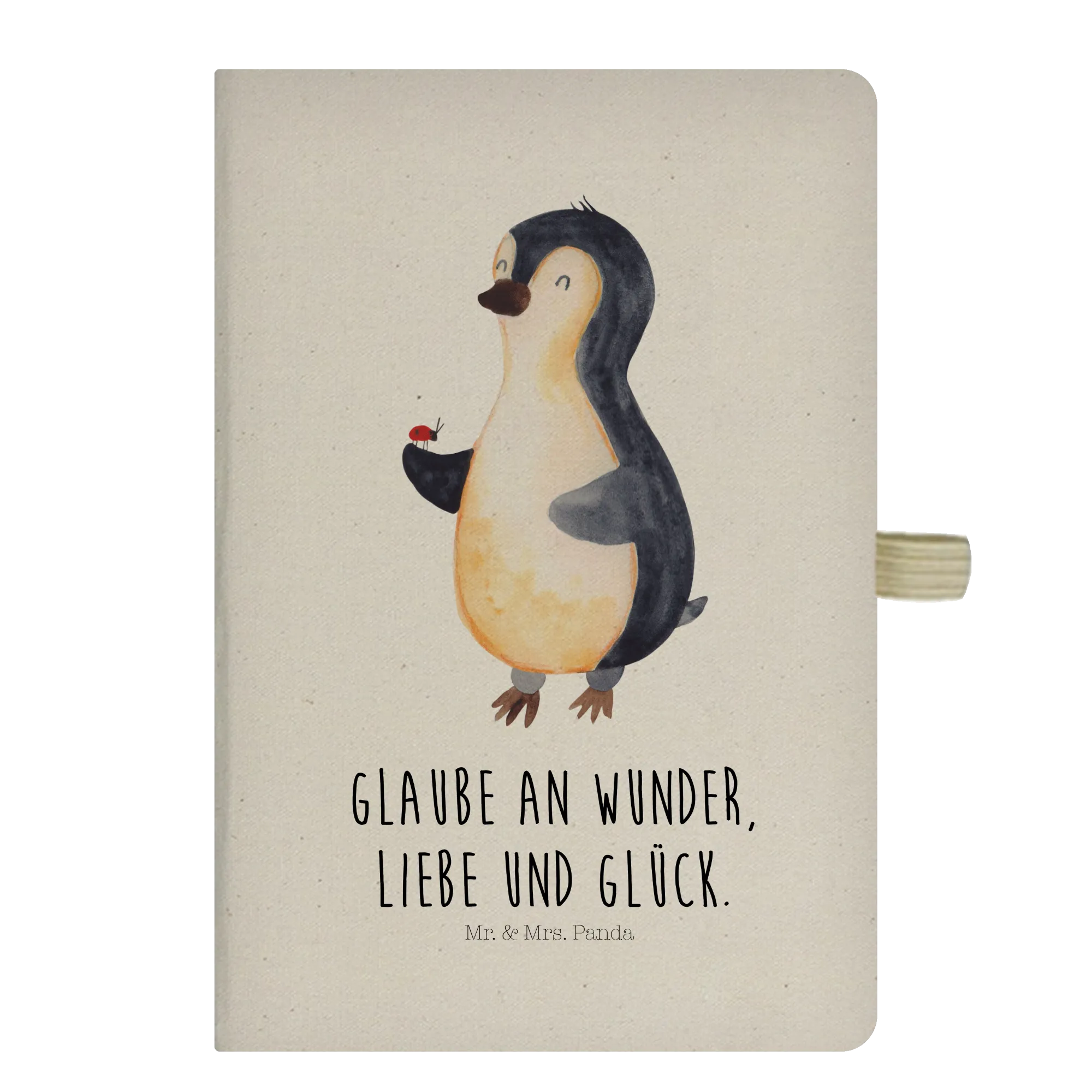 Ein treuer Begleiter voller Freude: Unser DIN A4 Baumwoll Notizbuch mit dem süßen Pinguin Marienkäfer aus der Pinguin - Kollektion von Mr. & Mrs. Panda ist mehr als nur ein Schreibbuch. Es ist ein kleines Stück Lebensfreude für deinen Alltag – mit dem liebevollen Spruch „Glaube an Wunder, Liebe und Glück.“ auf dem Cover. 🐧🐞