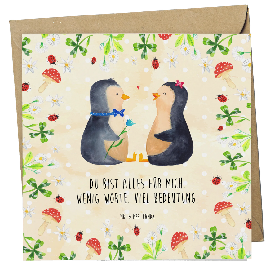 Diese hochwertige Klappkarte ist ideal als Hochzeitskarte, Verlobungskarte, zum Hochzeitstag oder als persönliche Jahrestagskarte. Die Illustration stammt aus der handgezeichneten Pinguin - Kollektion von Mr. & Mrs. Panda und strahlt Wärme sowie Lebensfreude aus. Sie bringt jeden zum Schmunzeln und macht aus deinem Gruß etwas ganz Besonderes.