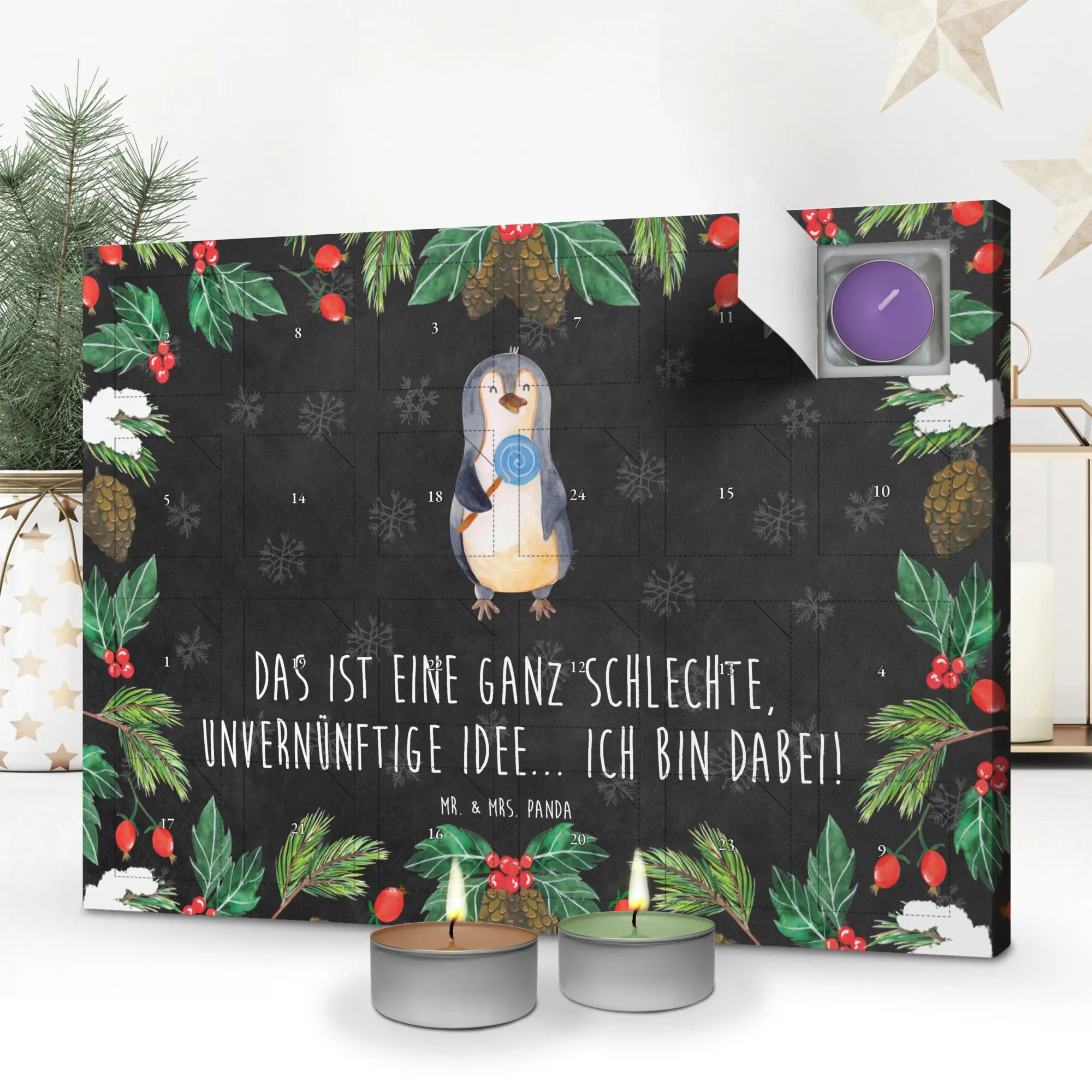 Der süße Pinguin in seiner flauschigen Hand hält stolz seinen Lieblingslutscher und zaubert jedem ein Lächeln ins Gesicht. Außerdem ist der Kalender aus stabilem Karton gefertigt und lässt sich sowohl aufstellen als auch aufhängen. Perfekt, um jeden Tag im Advent zu zelebrieren! Die liebevolle Zeichnung von Mrs. Panda bringt zusätzlich eine Portion Weihnachtszauber in deinen Raum.