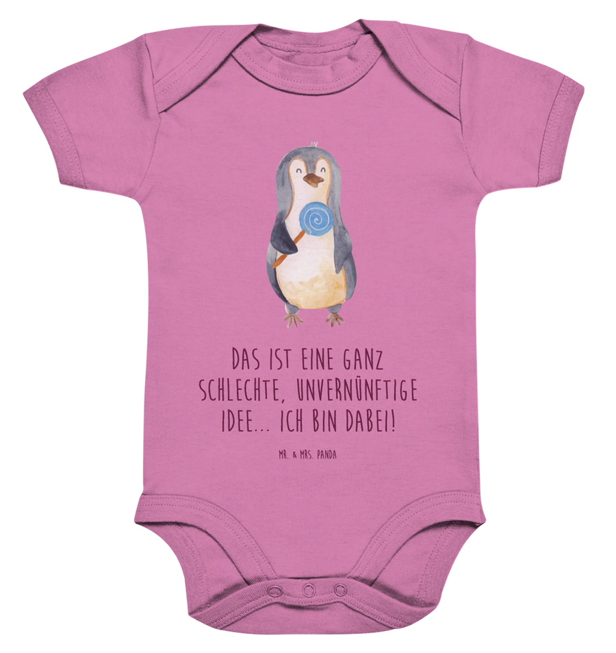 Mit diesem Outfit sorgt das Baby garantiert für Aufsehen, denn das süße Design in Bubble Gum Pink spricht für sich. Als Geschenk zur Babyparty oder als erstes Kleidungsstück ist er sowohl praktisch als auch niedlich. Über einen kleinen Pinguin mit Lolli freut sich jeder – und noch dazu mit dem Spruch "Das ist eine ganz schlechte, unvernünftige Idee... Ich bin dabei!" hat er das Potential, zum Favoriten im Kleiderschrank deines Lieblings zu werden.
