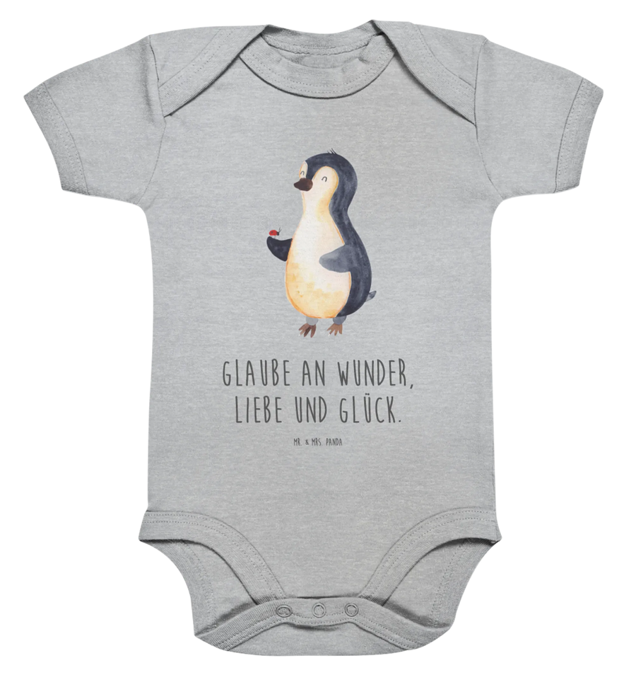 Der Organic Baby Body Pinguin Marienkäfer von Mr. & Mrs. Panda ist das perfekte Geschenk zur Geburt oder zur Baby-Erstausstattung! Mit diesem fröhlichen und liebevoll gestalteten Babystrampler zauberst du jedem beschenkten kleinen Erdenbürger ein Lächeln ins Gesicht. Das niedliche Motiv zeigt einen knuddeligen Pinguin, der einen fröhlichen Marienkäfer auf seiner Flosse willkommen heißt. Die Kombination aus dem lustigen Pinguin und dem süßen Marienkäfer sorgt nicht nur für gute Laune, sondern steht auch für Lebensfreude, Glück und Liebe. Die liebevolle Gestaltung ist nicht nur ein echter Blickfang, sondern vermittelt auch die Botschaft: "Glaube an Wunder, Liebe und Glück!".