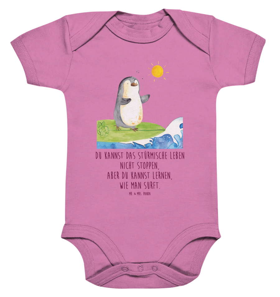 Organic Baby Body Pinguin Surfer - 6. - 12. Monat - mit Spruch - Bubble Gum Pink