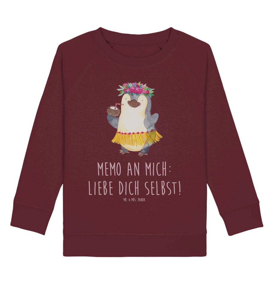Organic Kinder Pullover „Pinguin Kokosnuss“ – Ein fröhlicher Begleiter für kleine Abenteurer aus der Pinguin - Kollektion von Mr. & Mrs. Panda. Der süße Pinguin mit Röckchen und einer Kokosnuss mit Strohhalm tanzt in der Sonne und verbreitet sofort gute Laune. Der elegante burgunderrote Hintergrund macht den Pullover zugleich besonders und alltagstauglich.