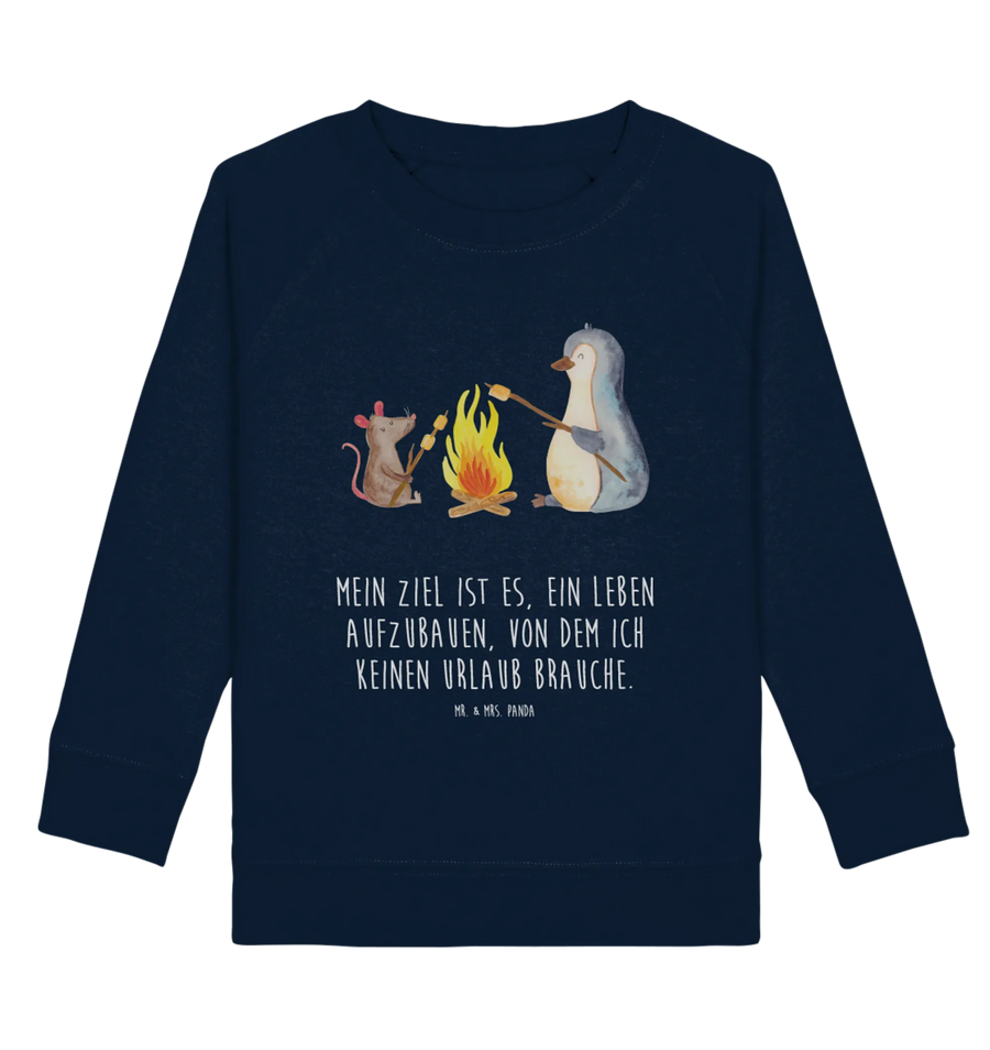 Stell dir vor, wie dein Kind an einem gemütlichen Lagerfeuer sitzt, während der süße Pinguin und seine Mausfreundin Marshmallows rösten. Mit liebevollen Details und einem inspirierenden Spruch, "Mein Ziel ist es, ein Leben aufzubauen, von dem ich keinen Urlaub brauche", ist dieser Pullover nicht nur ein modisches Highlight, sondern auch eine motivierende Botschaft.