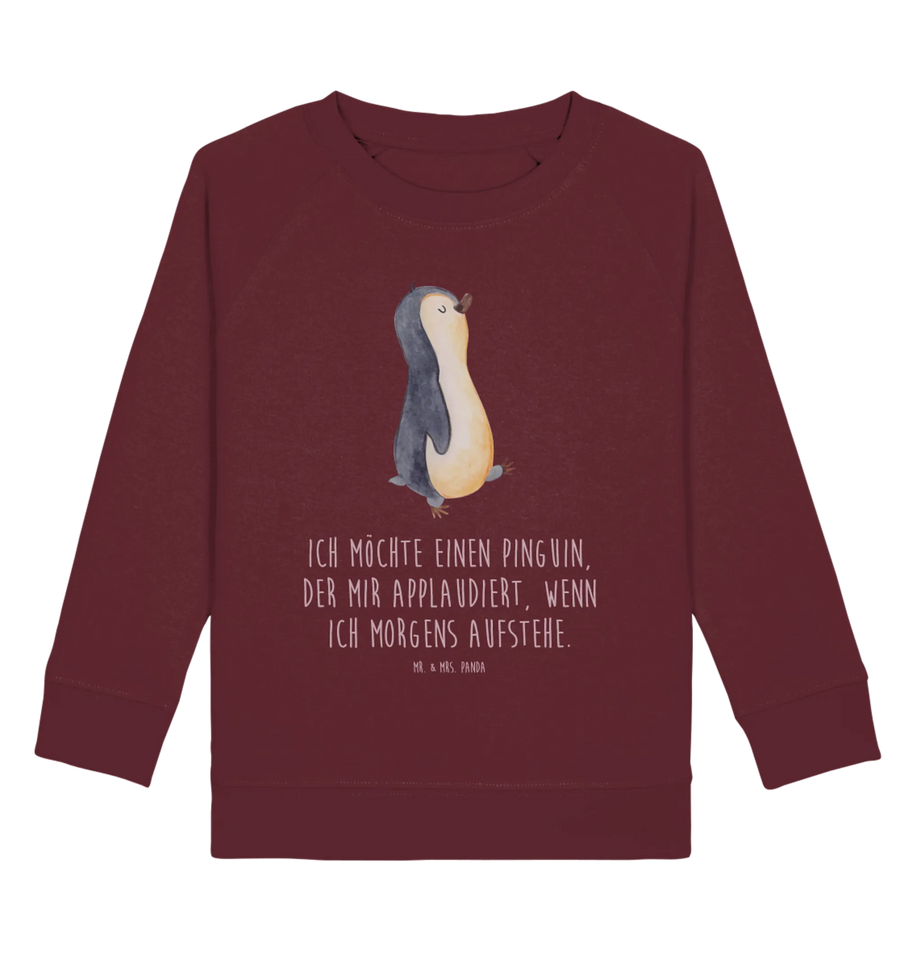 Hergestellt aus hochwertiger Bio-Baumwolle, ist der Pullover nicht nur besonders weich, sondern auch umweltfreundlich. Die elastischen Bündchen sorgen dafür, dass der Pullover perfekt sitzt und mitwächst. Jeder Pullover wird mit viel Liebe von Mr. & Mrs. Panda entworfen und handgezeichnet, was jedem Kleidungsstück einen einzigartigen Charme verleiht. Der Spruch "Ich möchte einen Pinguin, der mir applaudiert, wenn ich morgens aufstehe." macht jeden Tag ein wenig heller und vermittelt ein positives Gefühl.