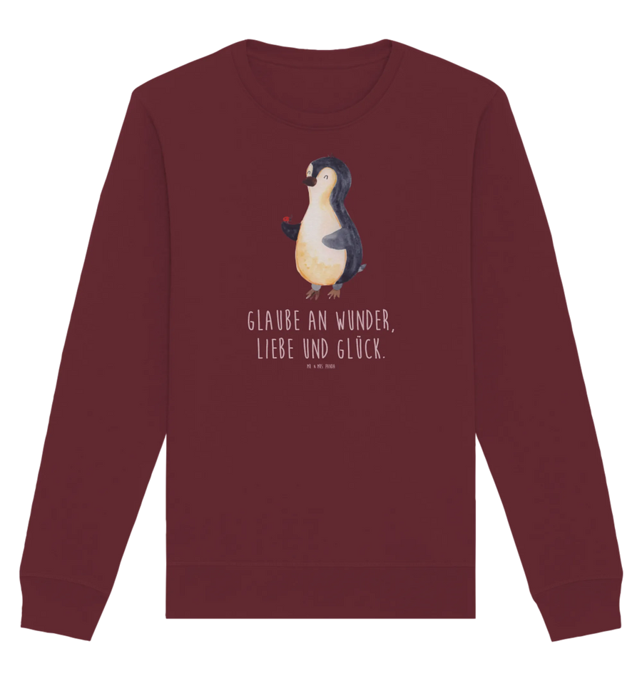 Die Kundschaft, die nach einem Pullover oder einem Sweatshirt sucht, ist überwiegend auf der Suche nach etwas Besonderem. Sei es zum Geburtstag, zu Weihnachten oder einfach nur so, dieser Organic Pullover sorgt für strahlende Gesichter und ein warmes Gefühl im Herzen. Die Kombination aus burgunderfarbener Eleganz und dem fröhlichen Pinguin-Motiv macht ihn zudem zu einem idealen modischen Statement.