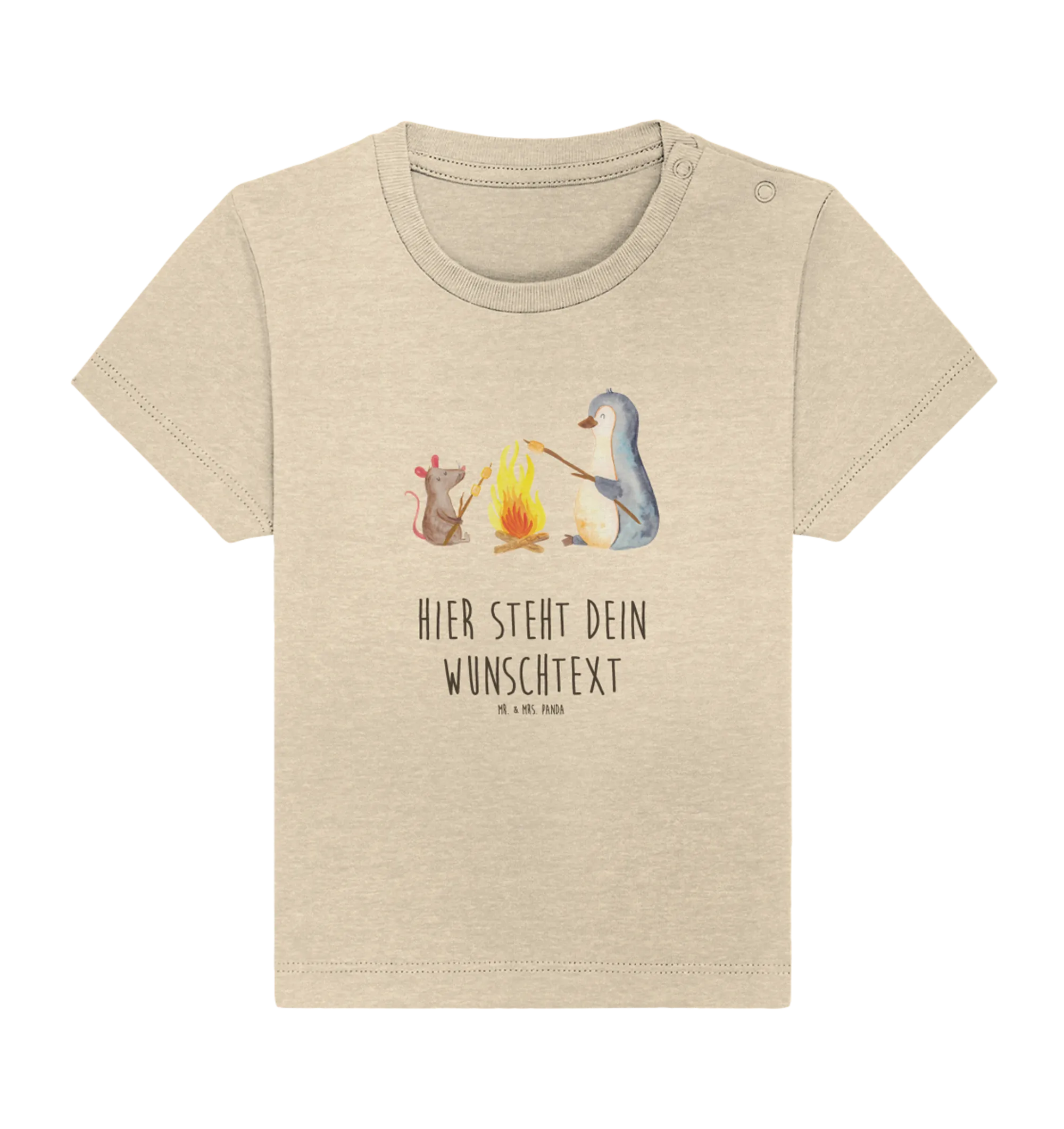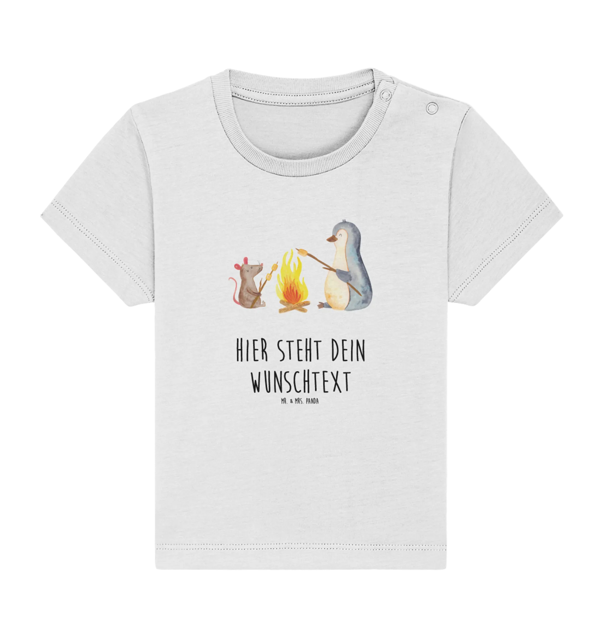 Kuschelig, persönlich und mit Herz: Das personalisierte Baby Shirt „Pinguin Lagerfeuer“ aus der Pinguin - Kollektion von Mr. & Mrs. Panda ist ein liebevolles Geschenk zur Geburt und ein echtes Highlight für die Erstausstattung. Das handgezeichnete Motiv zeigt einen süßen Pinguin und eine kleine Maus am Lagerfeuer, die Marshmallows grillen – eine Szene voller Wärme und Geborgenheit.