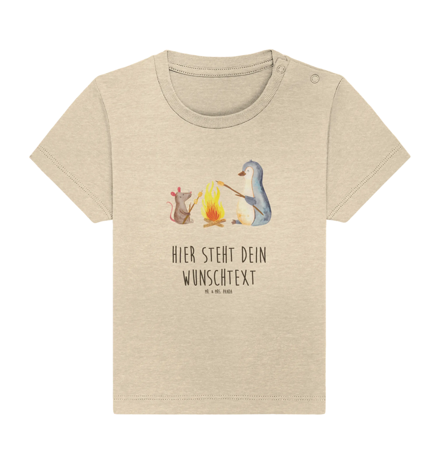 Kuschelig, persönlich und mit Herz: Das personalisierte Baby Shirt „Pinguin Lagerfeuer“ aus der Pinguin - Kollektion von Mr. & Mrs. Panda ist ein liebevolles Geschenk zur Geburt und ein echtes Highlight für die Erstausstattung. Das handgezeichnete Motiv zeigt einen süßen Pinguin und eine kleine Maus am Lagerfeuer, die Marshmallows grillen – eine Szene voller Wärme und Geborgenheit.