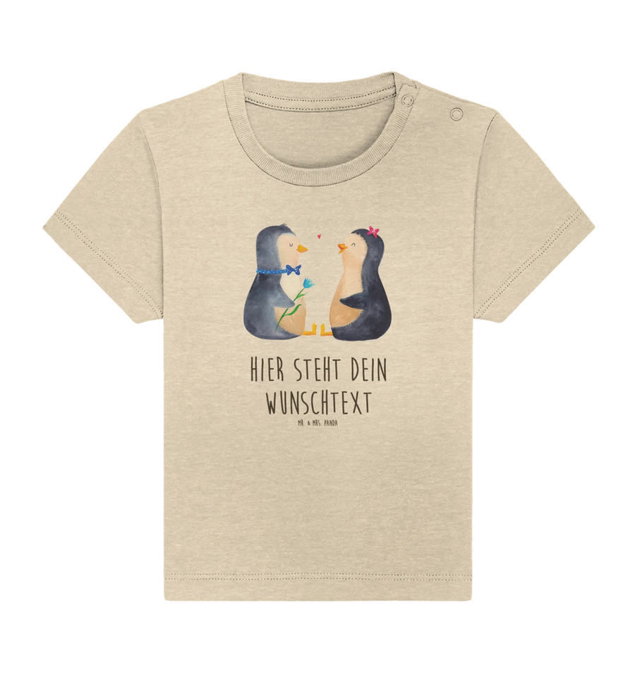 Das personalisierte Baby T-Shirt mit dem süßen Motiv des Pinguin Pärchens aus der Pinguin - Kollektion von Mr. & Mrs. Panda ist der perfekte Weg, um die Liebe zu deinem kleinen Liebling zu zeigen.
