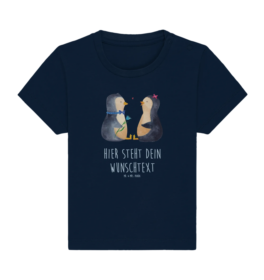 Das personalisierte Baby T-Shirt mit dem süßen Motiv des Pinguin Pärchens aus der Pinguin - Kollektion von Mr. & Mrs. Panda ist der perfekte Weg, um die Liebe zu deinem kleinen Liebling zu zeigen.