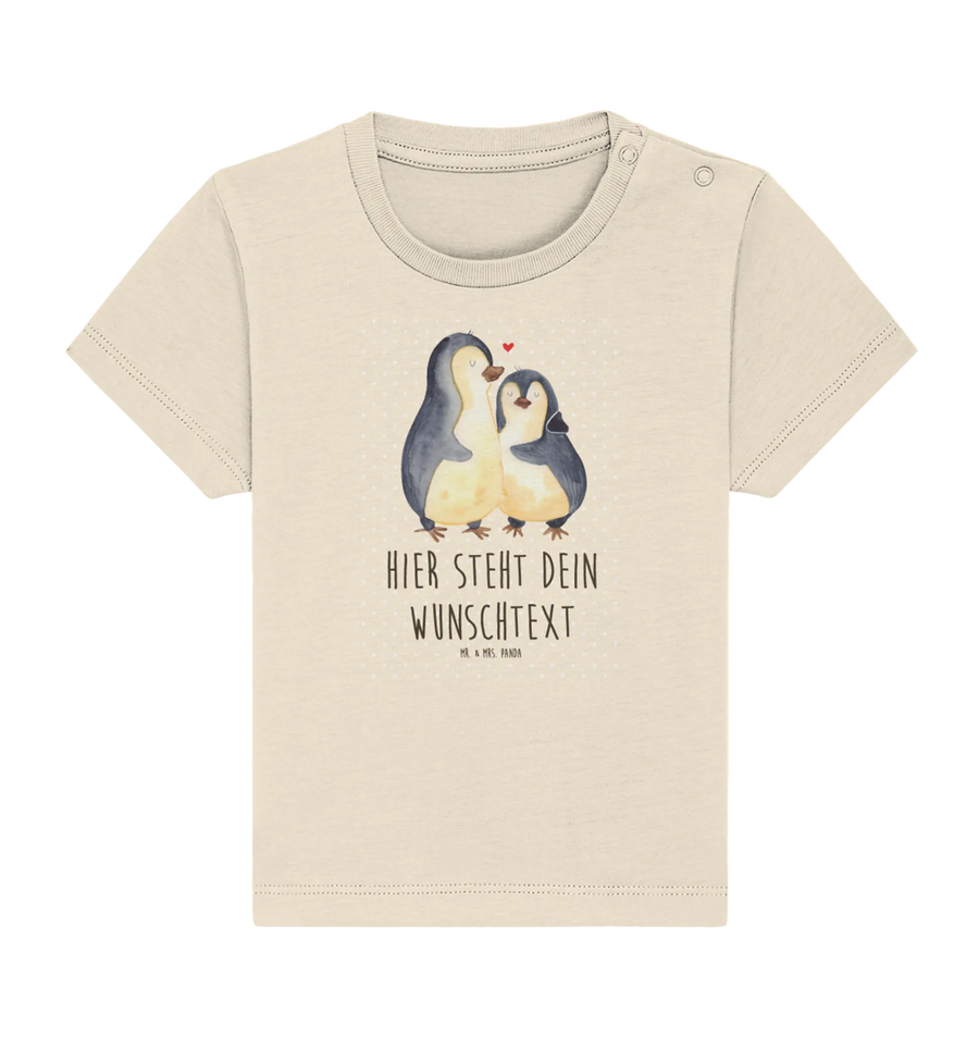 Das personalisierte Baby T-Shirt mit dem zauberhaften Motiv, einem umarmenden Pinguin aus der besonderen Pinguin-Kollektion von Mr. & Mrs. Panda, ist das perfekte Geschenk für frischgebackene Eltern oder als liebevolle Überraschung zur Taufe des kleinen Lieblings. Es strahlt Zuneigung und Verbundenheit aus und ist damit nicht nur praktisch, sondern auch voller Liebe.
