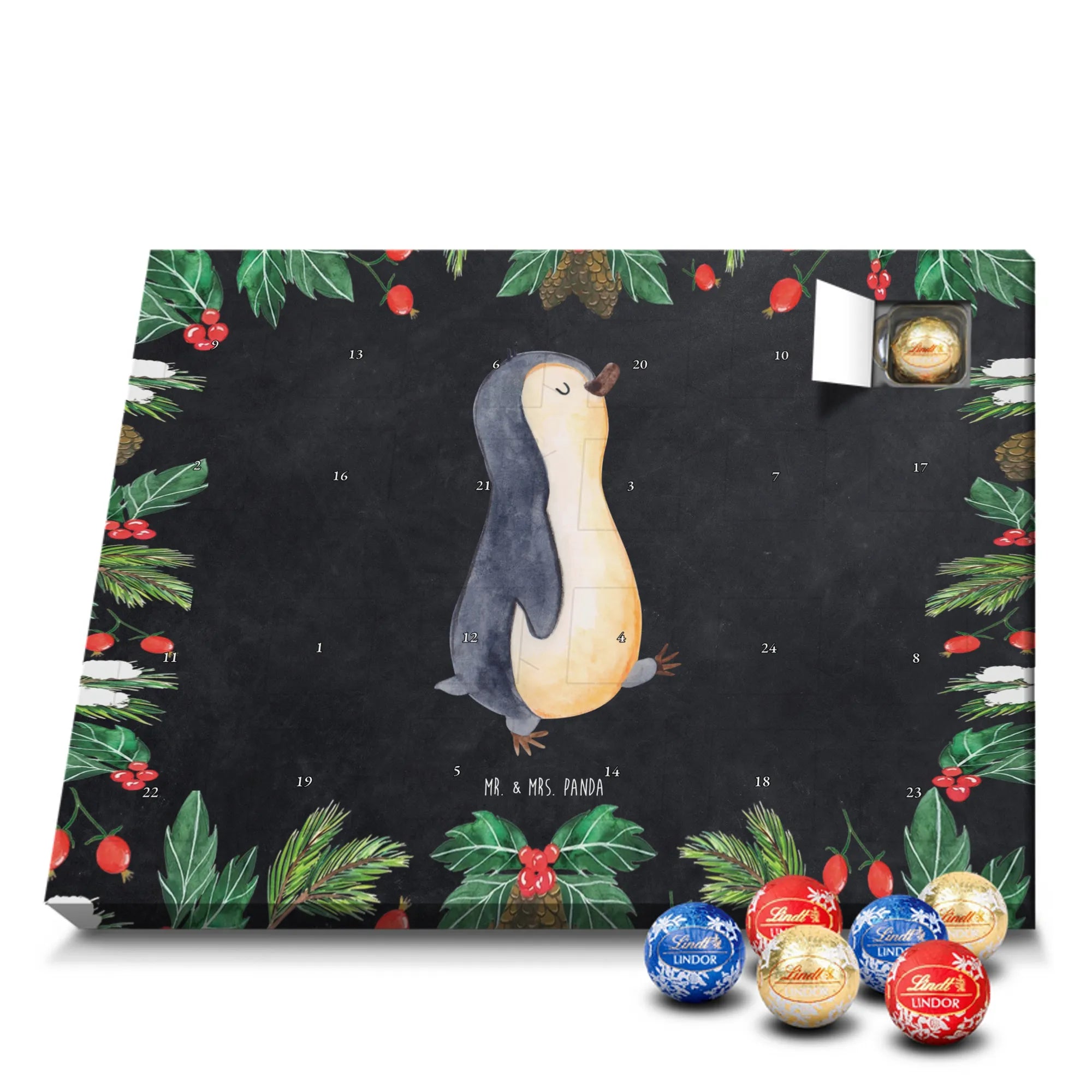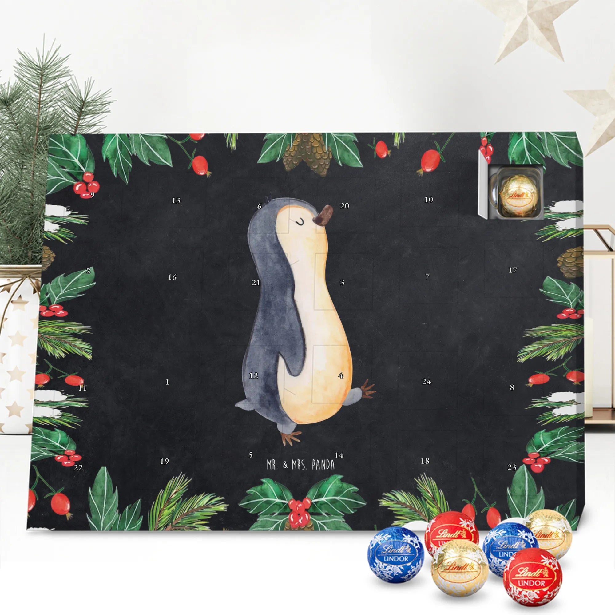 Beginne deine Adventszeit mit einem Lächeln! Unser Adventskalender kombiniert liebevolle Illustration und feine Markenschokolade (LINDOR) – 24 einzeln verpackte Kugeln in den Sorten Vollmilch, Feinherb und Weiße Schokolade. Der kleine, tollpatschige Pinguin auf dem kreidetafelfarbenen Hintergrund ist handgezeichnet von Mr. & Mrs. Panda und trägt den charmanten Slogan:
