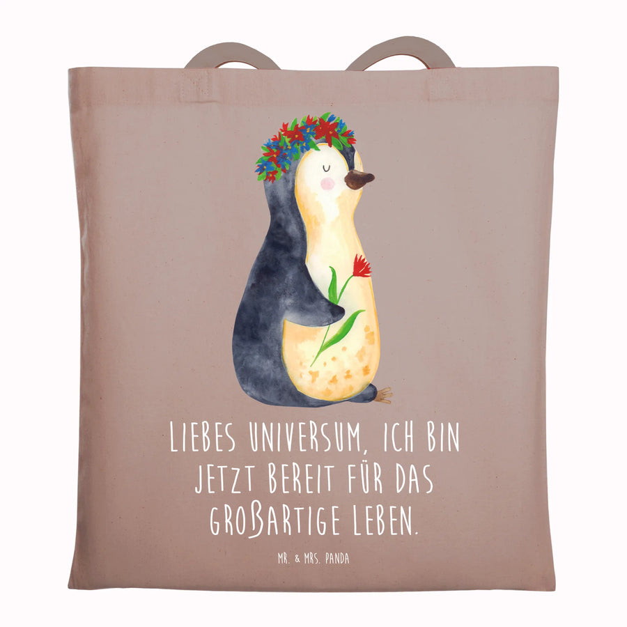 Tragetasche Pinguin Blumen - mit Spruch - Braun Pastell