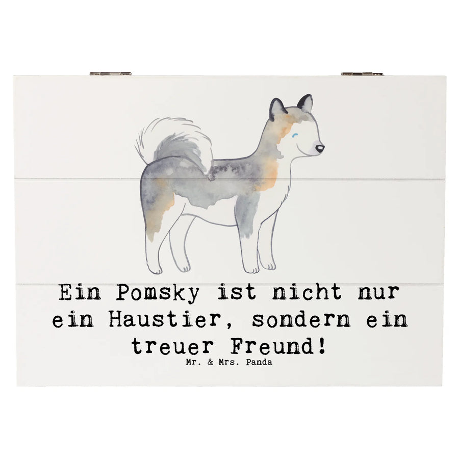 Die wunderschöne Holzkiste von Mr. & Mrs. Panda ist die perfekte Aufbewahrung für all deine kostbaren Schätze! Mit einem liebevoll handgezeichneten Motiv eines Pomskys und dem passenden Slogan "Ein Pomsky ist nicht nur ein Haustier, sondern ein treuer Freund!" repräsentiert diese Kiste nicht nur Stil, sondern auch eine besondere Verbindung zu deinem vierbeinigen Freund.