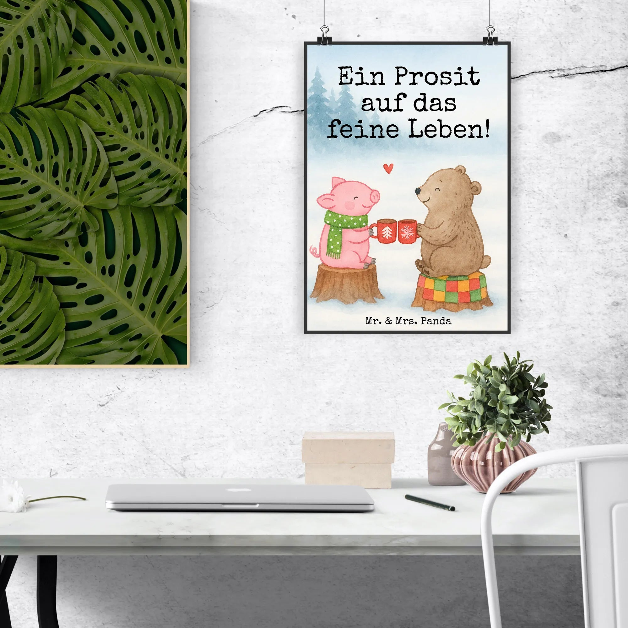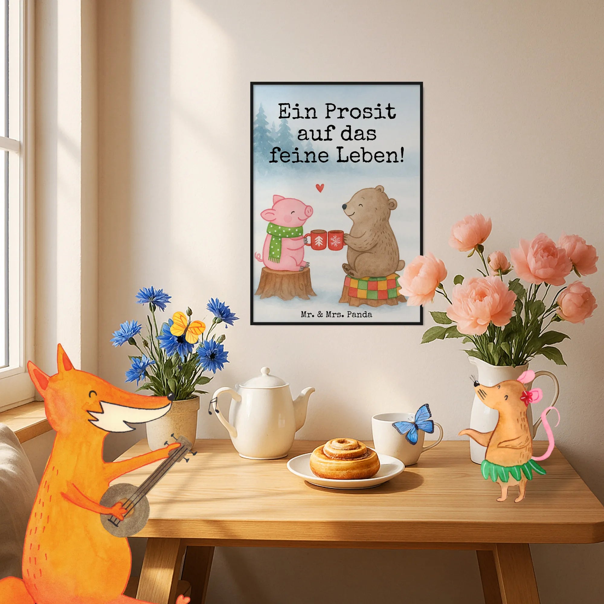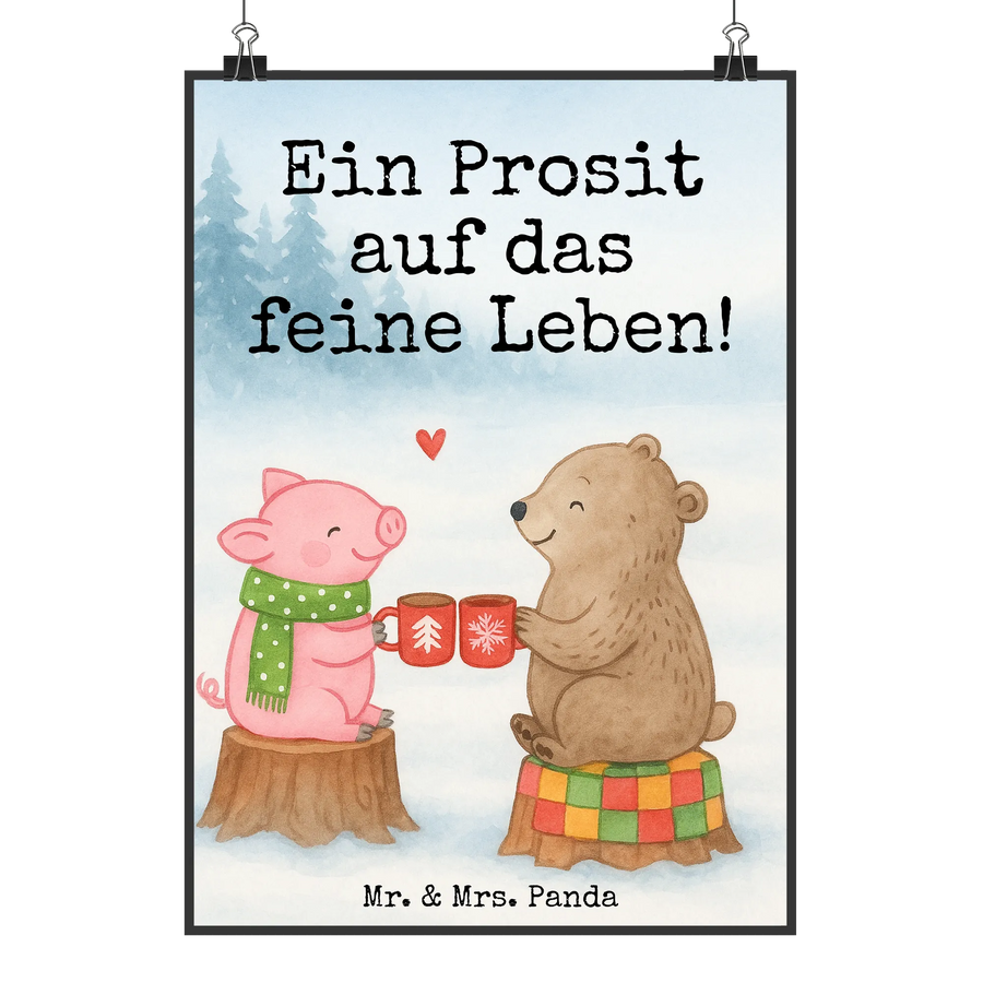 Mit einem Herzen, das so groß ist wie der Schnee draußen, stoßen unser kleiner Schweinefreund und sein Bärenfreund auf den Zauber der Weihnachtszeit an. Sie sitzen zusammen auf einem urigen Baumstumpf und halten ihre Tassen voller Freude und Glück hoch. 'Ein Prosit auf das feine Leben!' ruft nicht nur die Wärme in uns hervor, sondern verbindet uns auch durch die Tradition des Feierns. Die beiden sind ein perfektes Beispiel dafür, dass es die Freundschaften sind, die unsere Winterabende verzaubern und die Erinnerungen schaffen, die wir für immer in unseren Herzen tragen werden. So wird jeder Schluck zu einem Moment des Glücks, getragen von der Inspiration, die die Feiertage bringen.