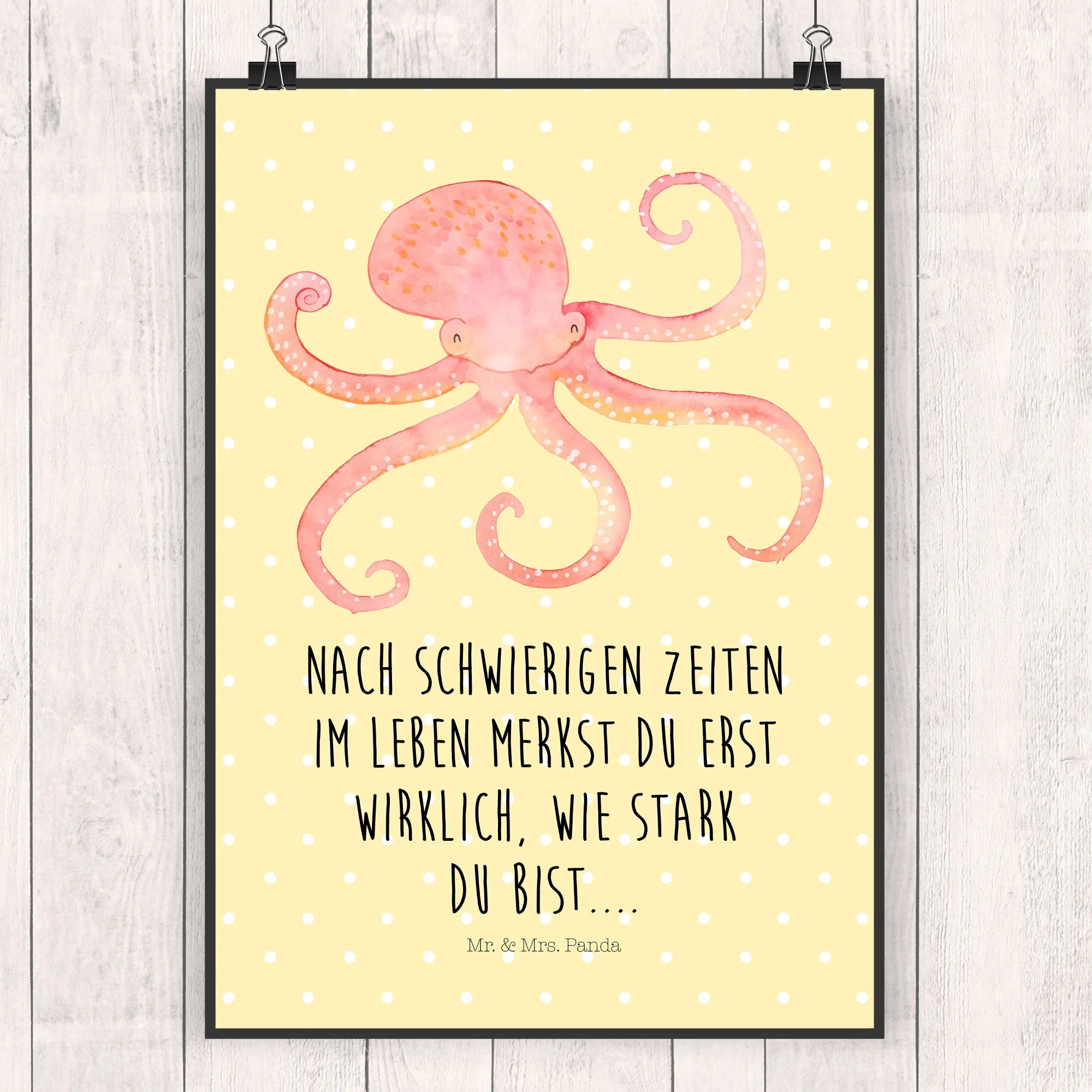 Mit seinen lebendigen Farben und dem fröhlichen Design zaubert der rote Tintenfisch, der fröhlich mit seinen vielen Armen winkt, immer ein Lächeln auf dein Gesicht. Die Botschaft, die auf diesem Poster steht, 'Nach schwierigen Zeiten im Leben merkst du erst wirklich, wie stark du bist...', erinnert uns daran, dass wir aus Herausforderungen lernen und wachsen können.