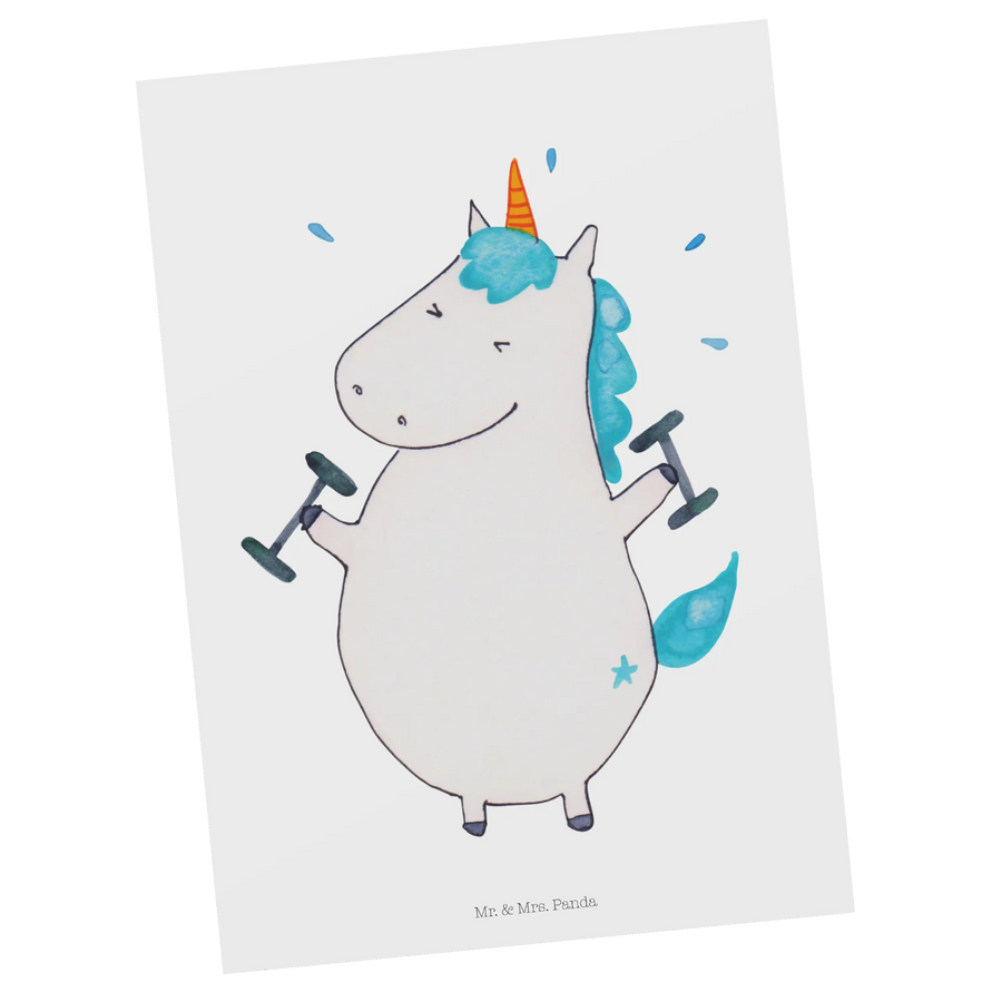 Die perfekte Postkarte für alle Fitness-Fans und Einhorn-Liebhaber! Diese einzigartige Postkarte von Mr. & Mrs. Panda zeigt ein süßes Einhorn, das mit zwei Hanteln trainiert und dabei spritzt. Ob du gerade ins Fitnessstudio gehst oder dich einfach nur aufraffen willst, unser Fitness-Einhorn ist die ideale Motivation!