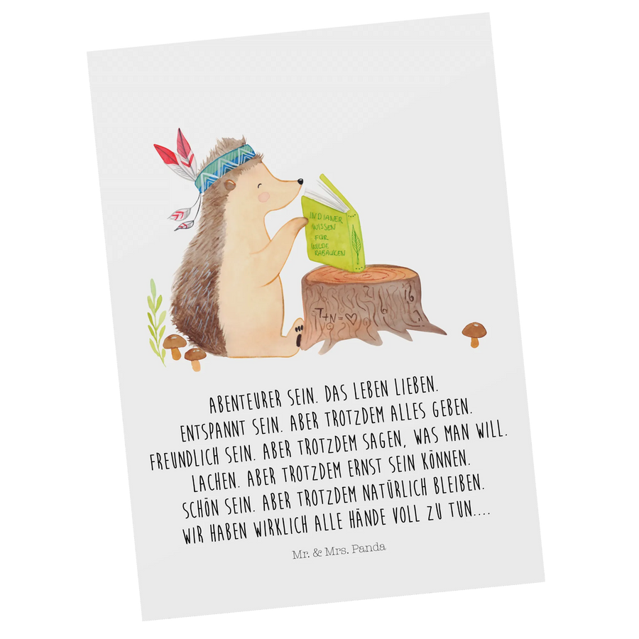 Die perfekte Postkarte für jeden Anlass – die Igel Indianer Postkarte aus der bezaubernden Waldtiere Kollektion von Mr. & Mrs. Panda! Diese einzigartige Postkarte zeigt einen süßen Igel mit Federschmuck, der es sich auf einem Baumstumpf gemütlich macht und ein Buch über Abenteuer liest.