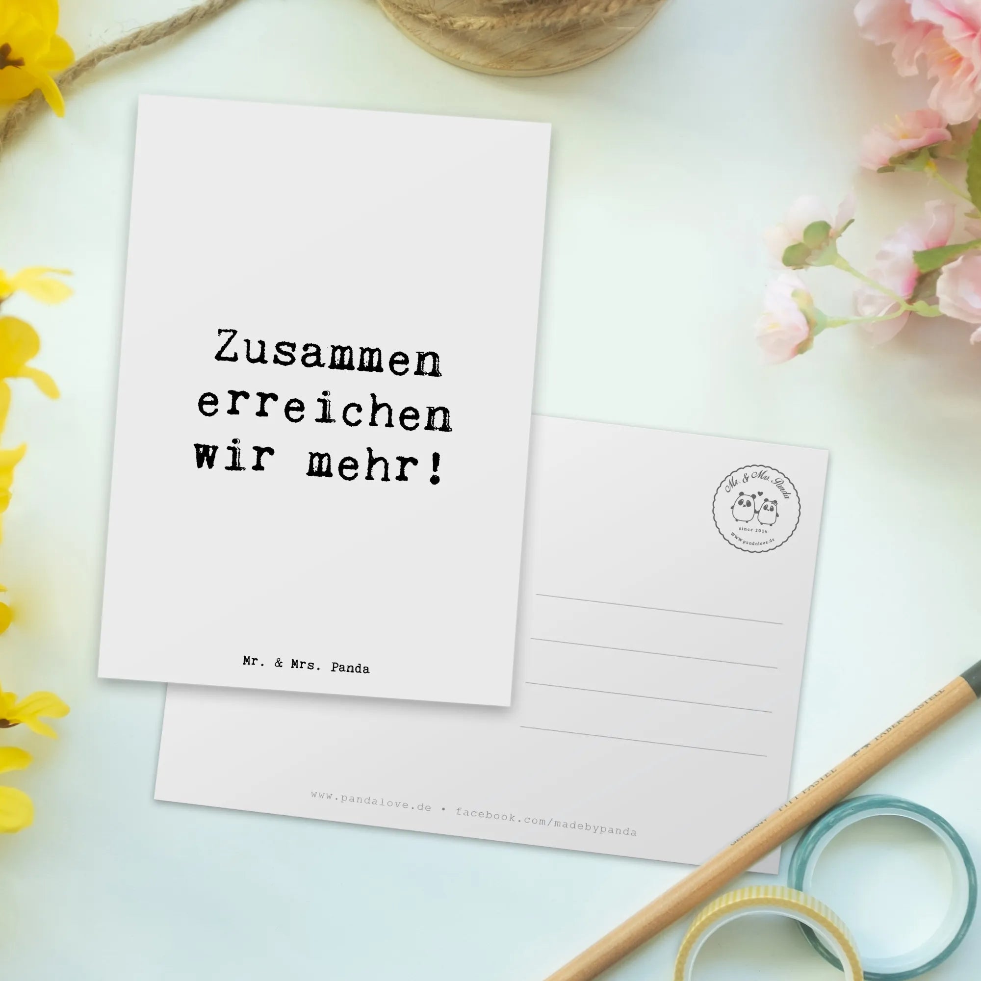 Eine einzigartige Postkarte von Mr. & Mrs. Panda – liebevoll gestaltet und mit einer klaren Botschaft: „Zusammen erreichen wir mehr!" Diese Postkarte aus der Mutmacher-Kollektion ist dein perfekter Begleiter, wenn du Teamgeist, Zuversicht und Dankbarkeit ausdrücken möchtest.