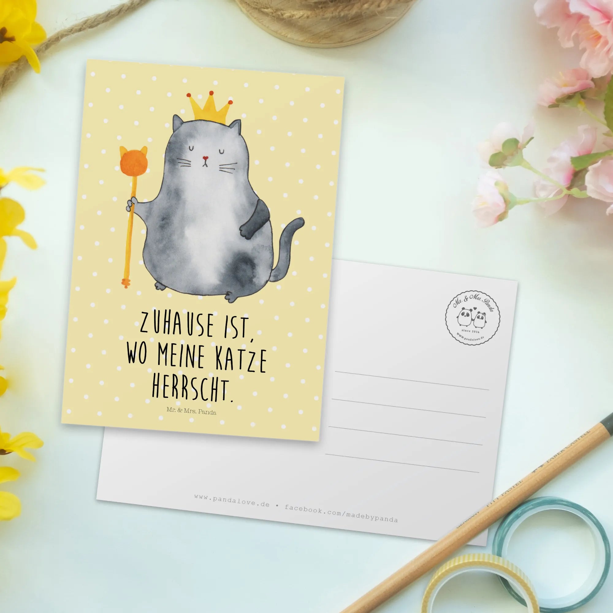 Das Motiv wurde liebevoll von Mrs. Panda handgezeichnet und fängt das freche, versnobte Wesen unserer Mietzen auf charmante Weise ein. Die freundliche Gelb Pastell Hintergrundfarbe macht die Karte zu einem fröhlichen Hingucker in jedem Zuhause und als Teil Deiner Katzendeko.