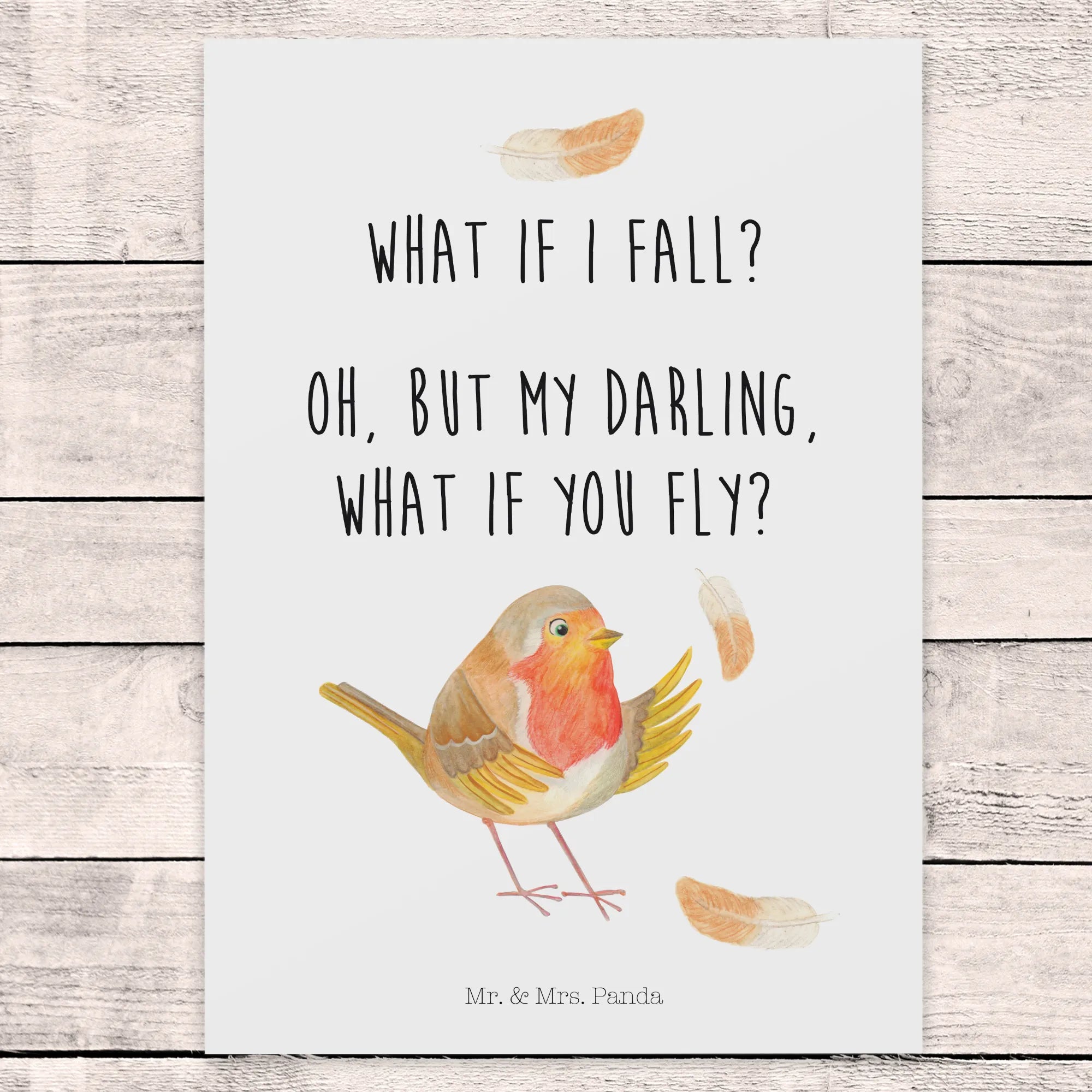 Suchst Du eine liebevolle Grußkarte, die Mut macht und gleichzeitig wie ein kleines Kunstwerk wirkt? Unsere Postkarte „Rotkehlchen mit Federn“ aus der Small World Kollektion von Mr. & Mrs. Panda vereint zarte Aquarell-Illustration und einen ermutigenden Spruch: „What if I fall? — Oh, but my darling, what if you fly?“