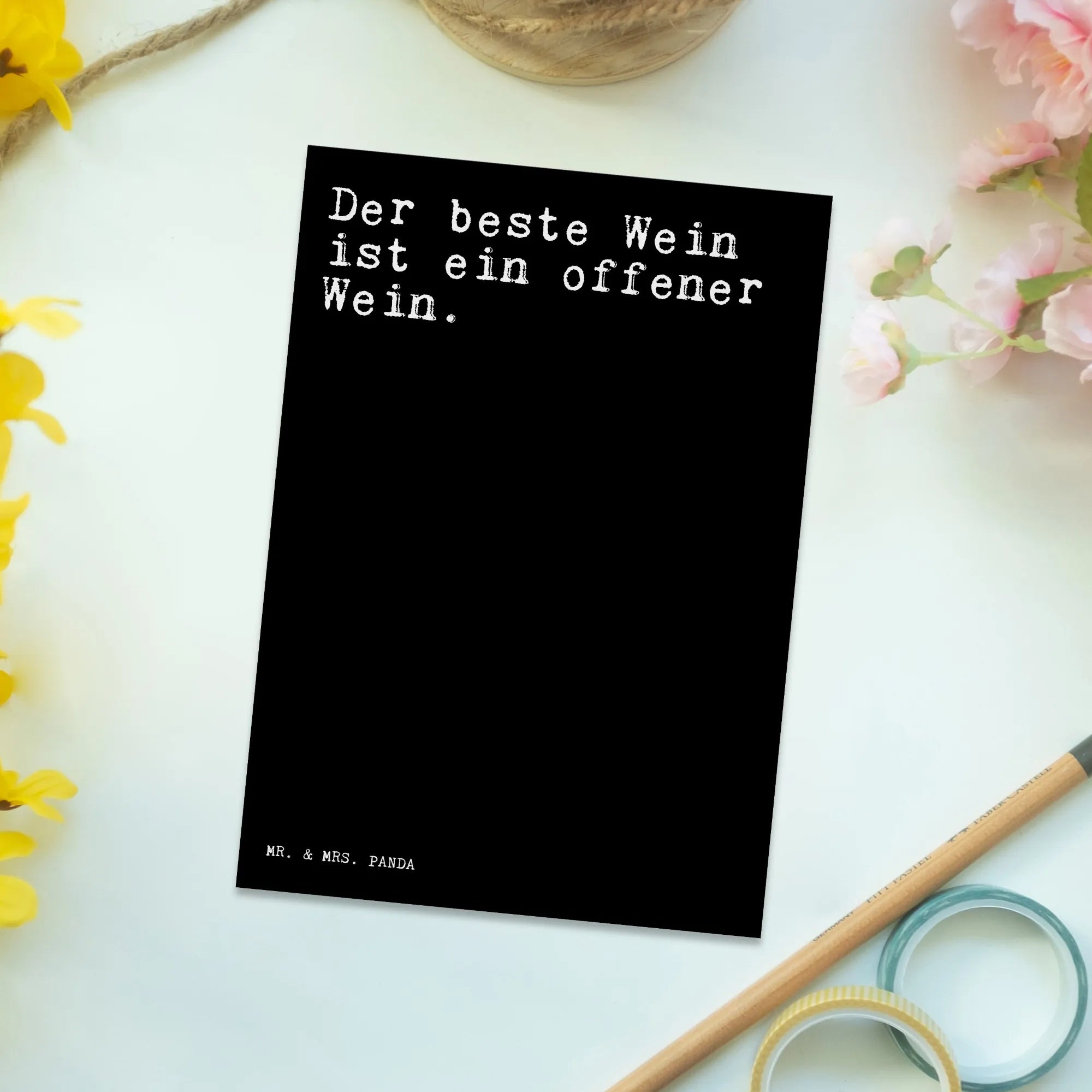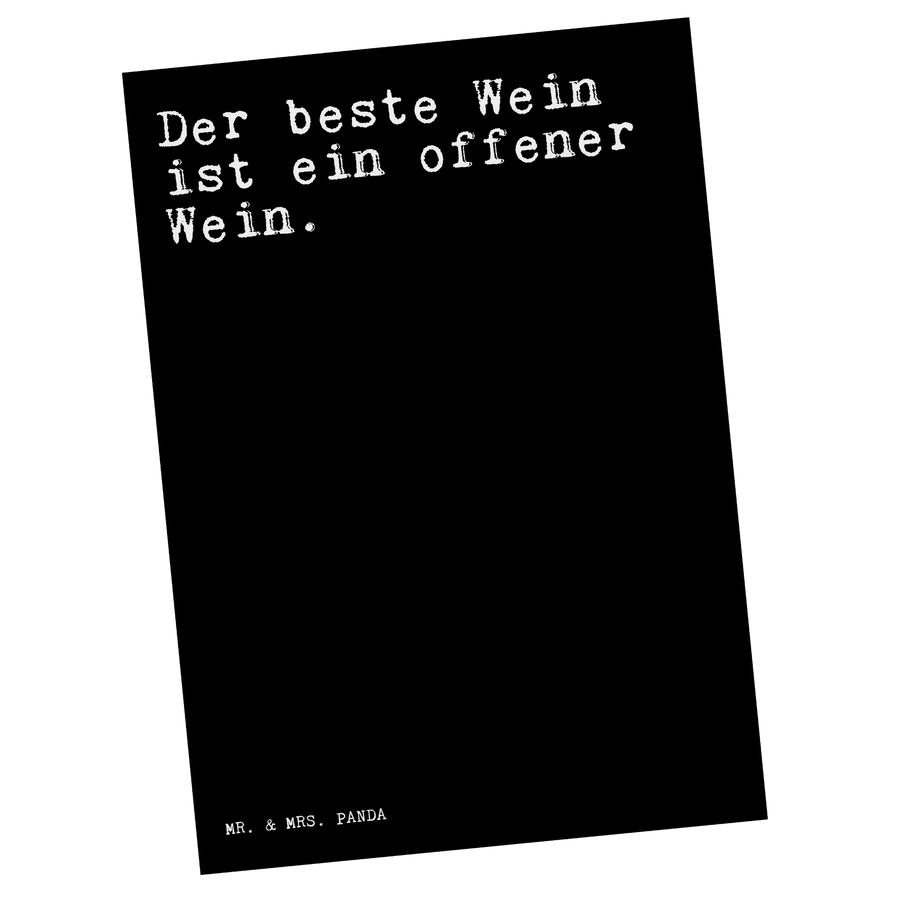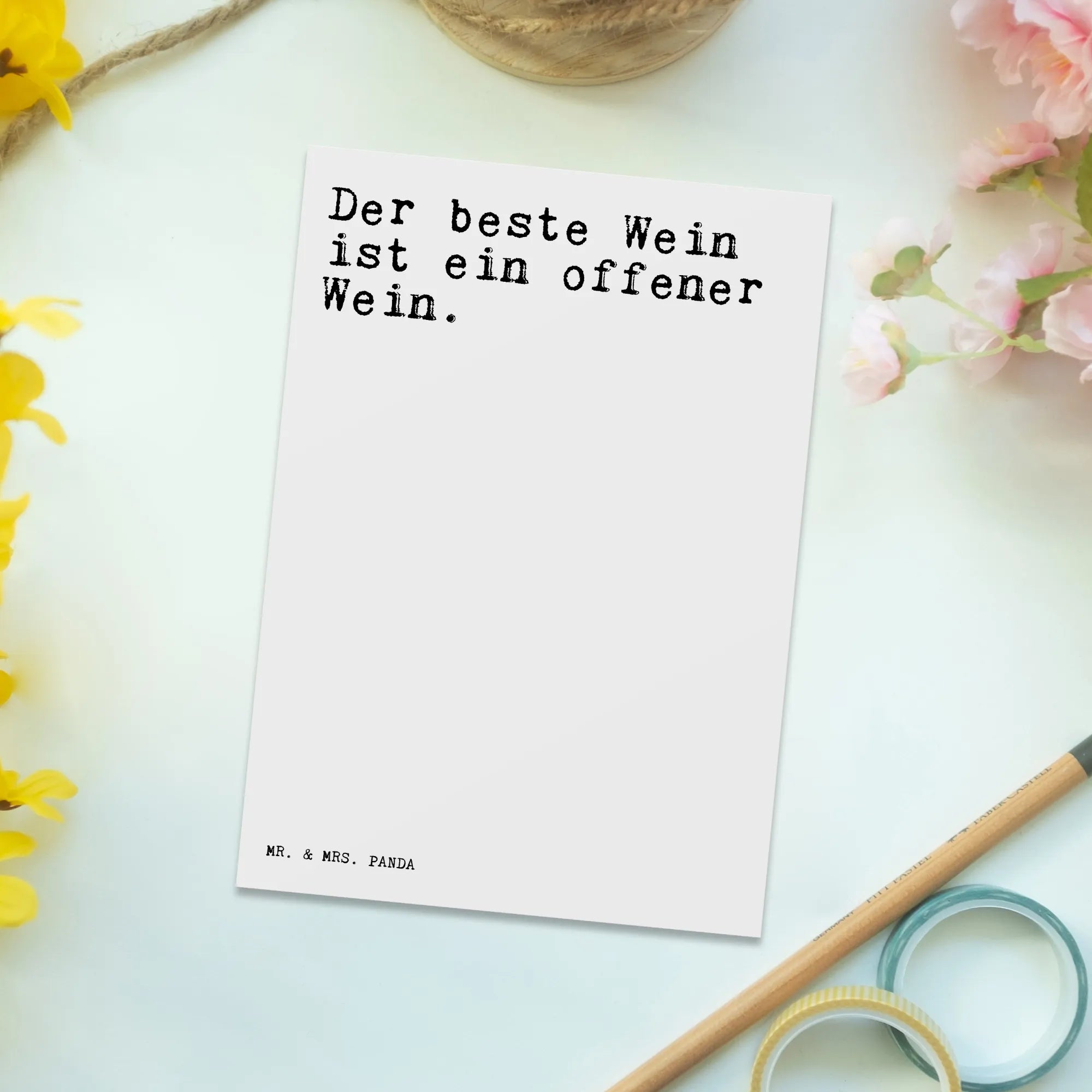 Die perfekte Postkarte für alle Weinliebhaber ist hier! Die einzigartige Postkarte von Mr. & Mrs. Panda trägt den witzigen Spruch "Der beste Wein ist ein offener Wein" und ist damit ein absolutes Must-Have für jeden Weinabend oder als Geschenk für Freunde und Familie, die gerne ein Gläschen genießen. Diese Karte ist nicht nur ein wunderschönes Design, sondern auch eine tolle Möglichkeit, um deinen Freunden einen herzlichen Gruß zu senden oder sie zu einem gemütlichen Weinabend einzuladen.