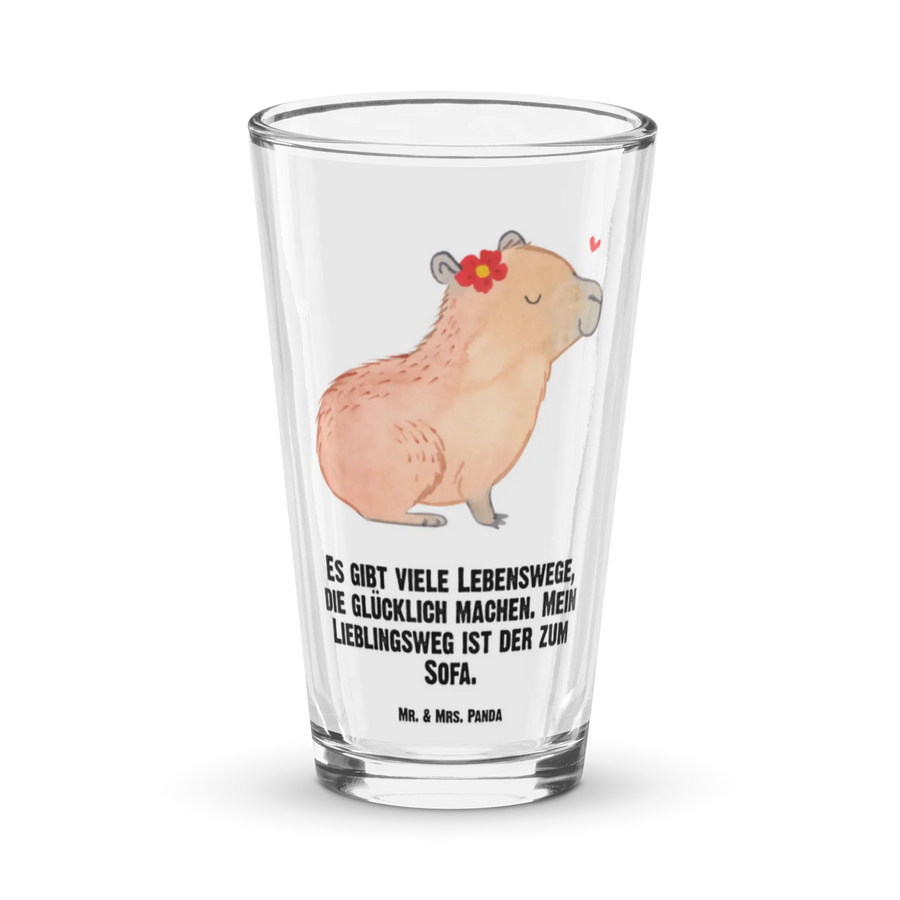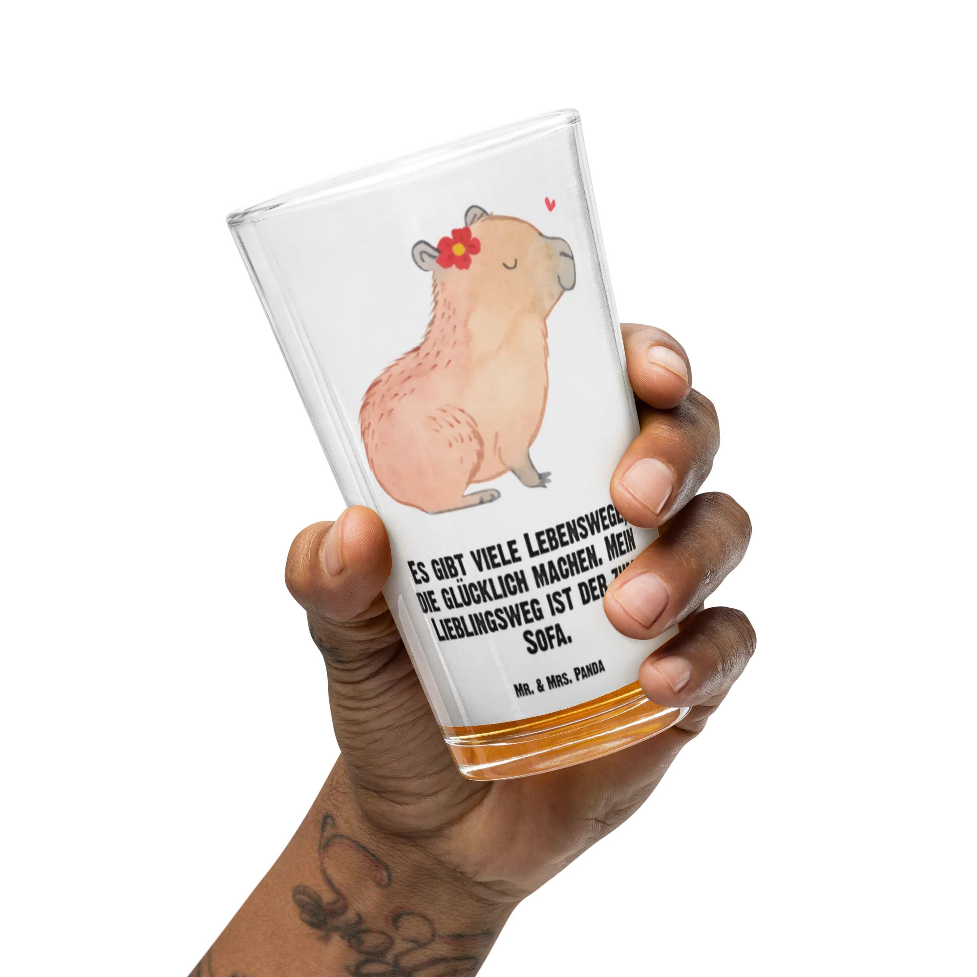 Willkommen in der zauberhaften Welt von Mr. & Mrs. Panda, wo ein kleines Capybara mit geschlossenen Augen und einem liebevollen Lächeln auf dich wartet. Auf diesem entzückenden Motiv trägt das Capybara eine rote Blume mit gelber Mitte auf dem Kopf, die ihm einen besonders verspielten Ausdruck verleiht. Ein schwebendes Herz über dem Capybara unterstreicht die herzliche Atmosphäre und lässt das Ganze noch zauberhafter wirken. Die warmen und sanften Farben der Illustration schenken ein Gefühl von Ruhe und Zufriedenheit. Der Spruch 'Es gibt viele Lebenswege, die glücklich machen. Mein Lieblingsweg ist der zum Sofa.' bringt die Gelassenheit und Freude, die dieses Motiv ausstrahlt, auf den Punkt, und lädt dich ein, dich dem Capybara anzuschließen und die einfachen, glücklichen Momente zu genießen.