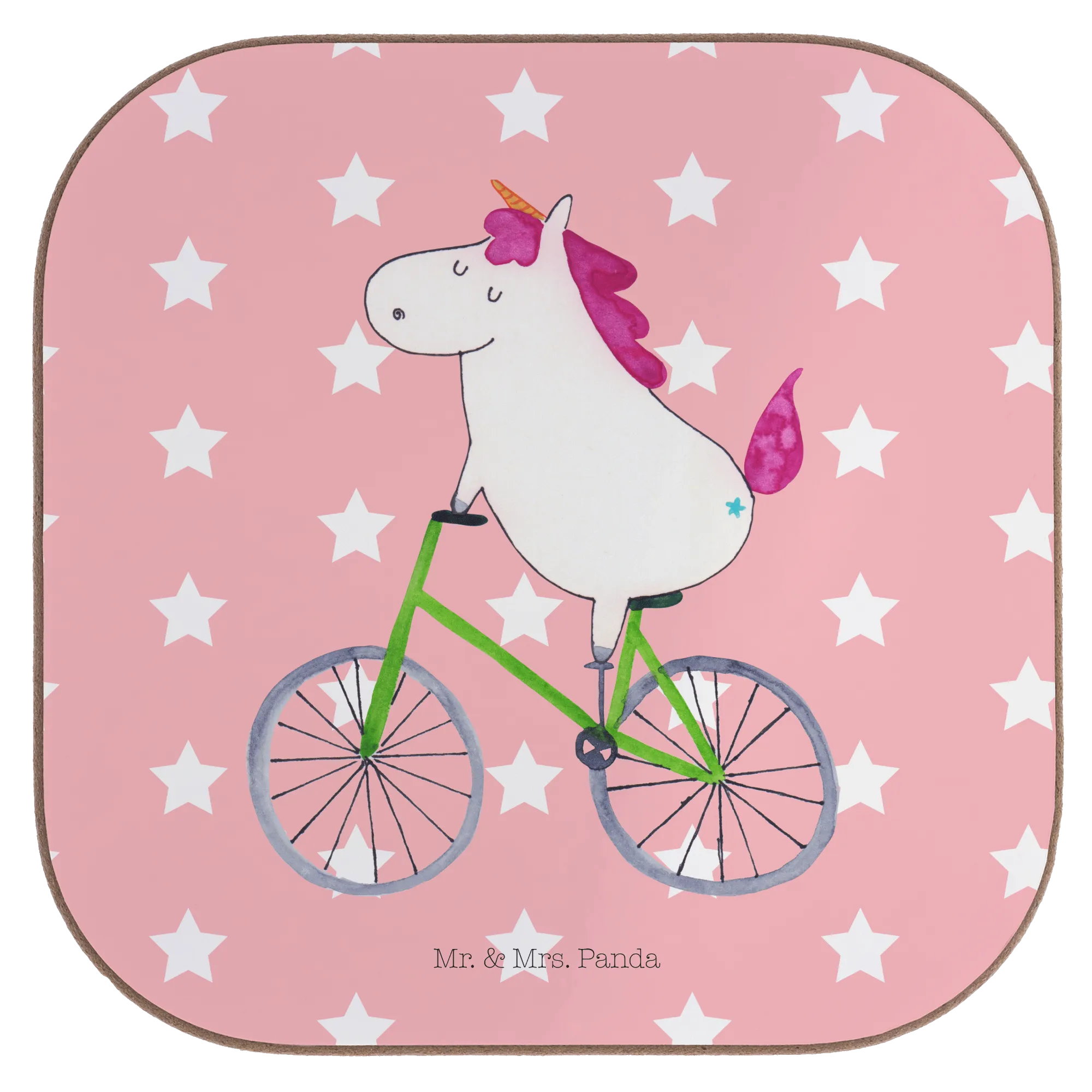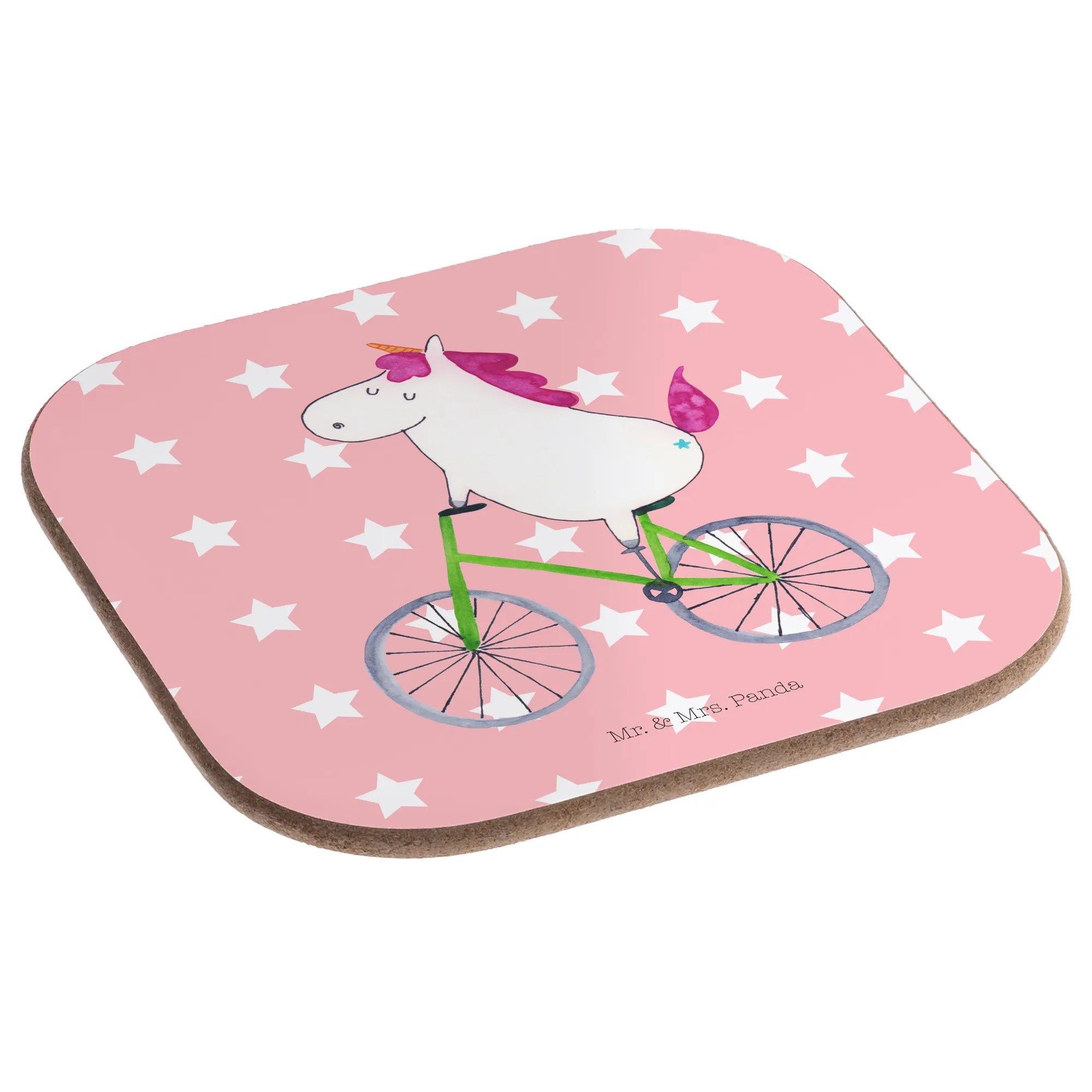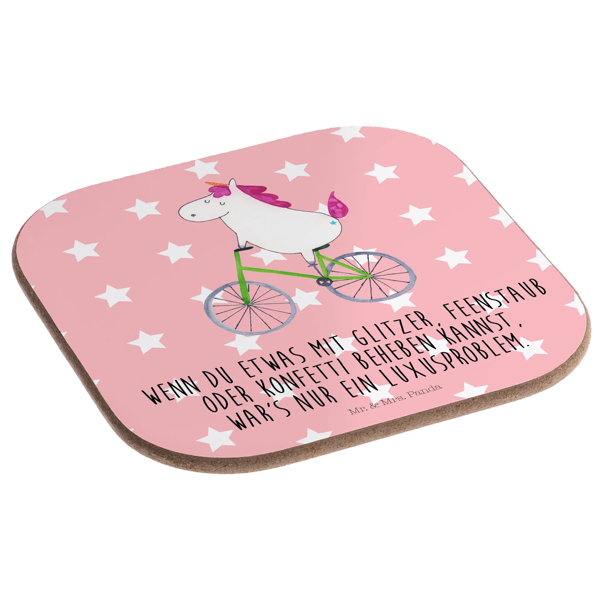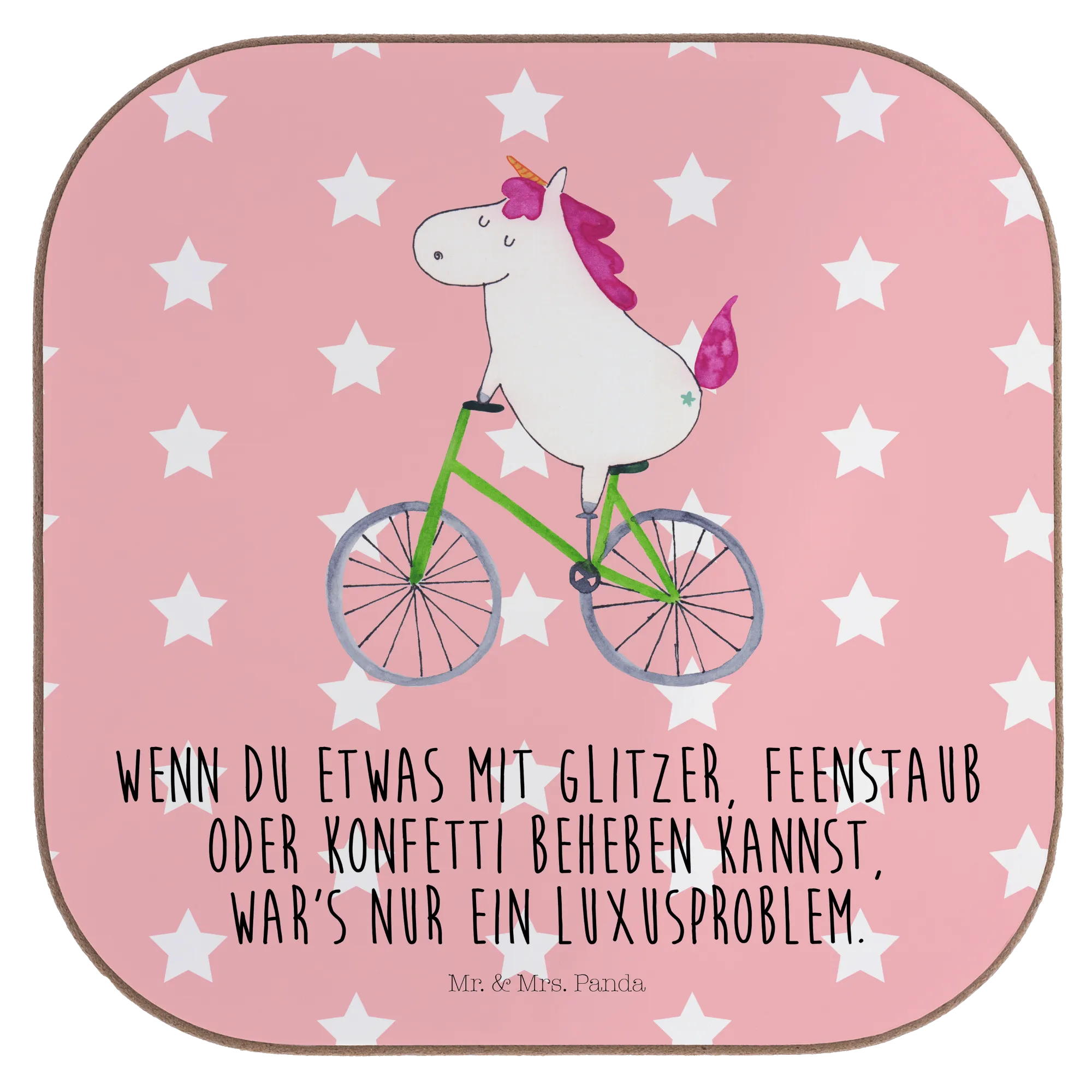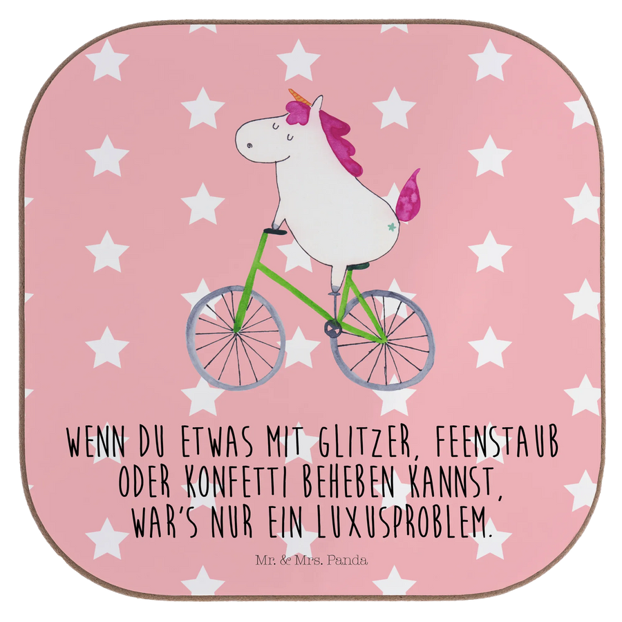 Quadratische Untersetzer Einhorn Radfahrer - mit Spruch - Rot Pastell